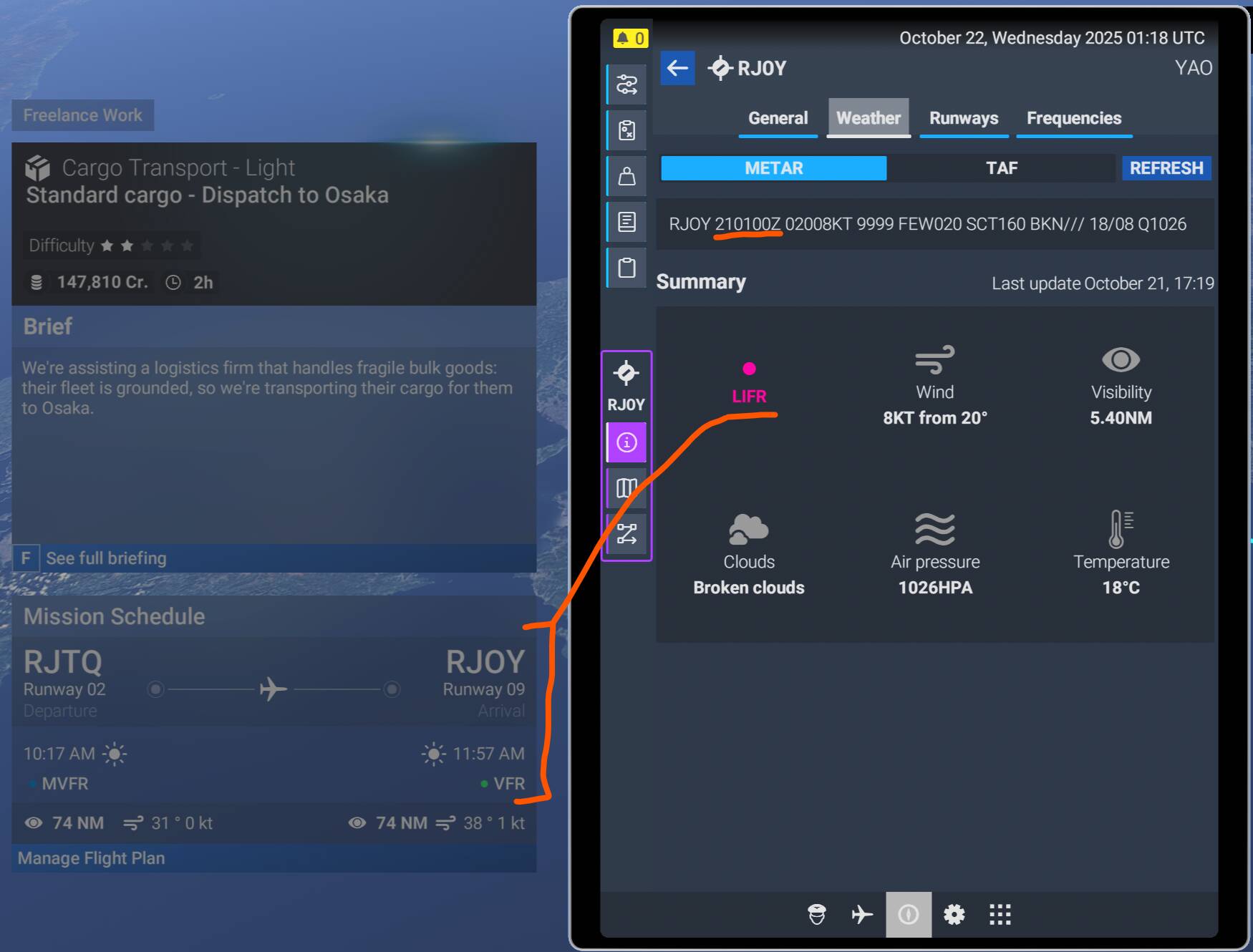 On the reply above, I did the most responsible sim pilotage I could. Before even accepting the mission, I checked the METAR/TAF at Departure and Destination airports. I verified the conditions were OK (was planning IFR) and even noted the timestamps of each METAR in a spreadsheet. I then used the EFB to check METARs of several airports along my route to be sure conditions were acceptable to fly a Cessna 172S in. I spent a LOT of time on pre-flight planning because that’s what you’re supposed to do as a real pilot. (I’ve started ground school and done a couple discovery flights in preparation for hopefully starting lessons one day.)