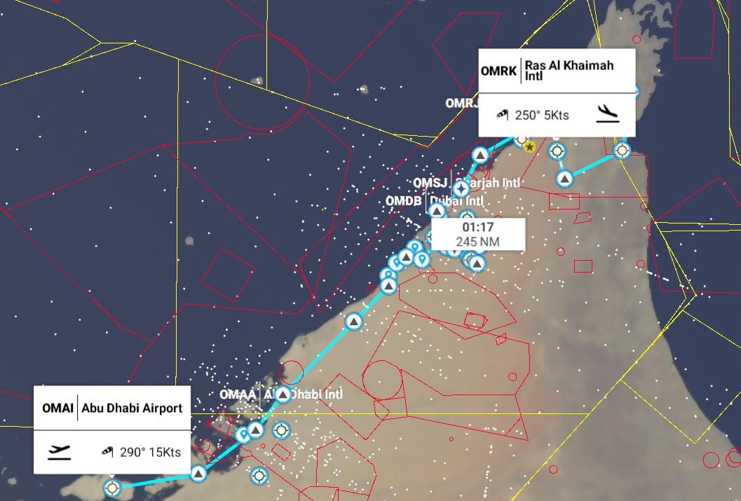 Starting by flying from OMAI then cruising around the coasts of the UAE till we reach the tallest city in the world, Dubai! Then landing in one of the smallest airports in the country OMSH, After which we will continue till Ras al Khaimah where we will pass over the Mounties and end the flight with a landing at OMRK.