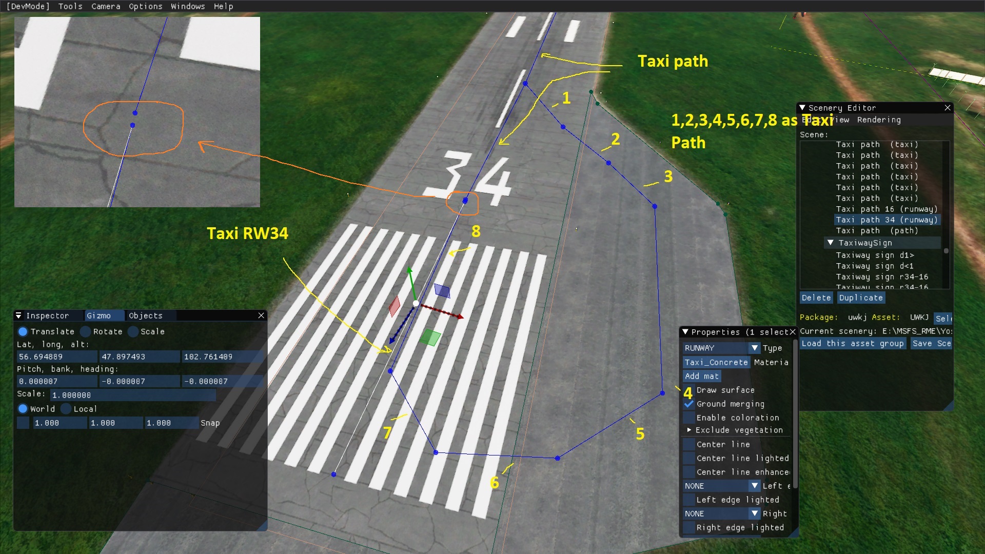 Purple lines: create taxiways with standard properties (you can name your taxiways as you like or leave it blank as I did on some pieces of my taxiways that connect the track)