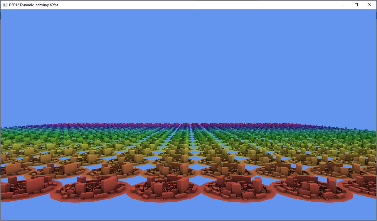 Below - modification of - DynamicIndex geometry contains 25x25 instances of a city block, each consisting of a 1MB mesh. It shows about 625MB of data. To render something like this in DX-11, my little board will go 18-20 FpS. With DX-12, I can run this baby at 60FpS, using Bundles.. Difference between the old DX-11 instancing and bundles is all elements may show a different texture: