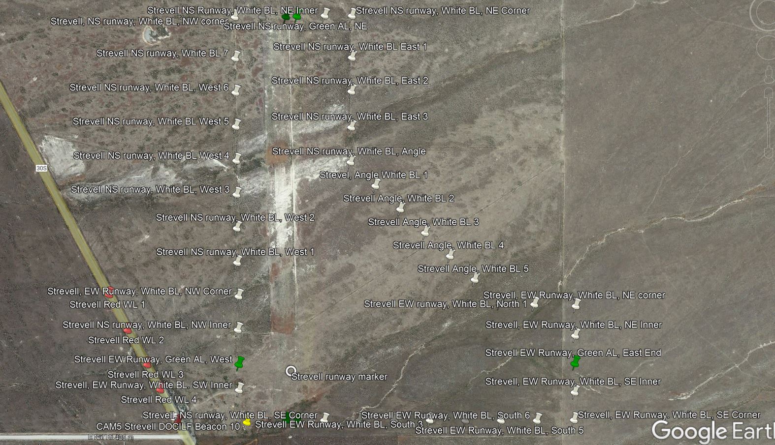 Green lights were used to mark the runway centrelines, two at each end of the principal runway (assumed to be N-S given that it was the longer of the two and still visible) and one for the secondary runway. White boundary lights then marked the remainder of the perimeter.