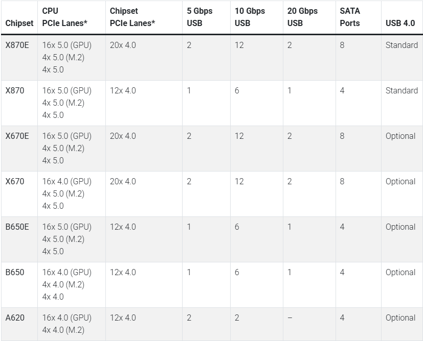 Unlike the previous 600-series chipsets, the difference between X870E and X870 is fairly large this generation. Although both will get you PCI-e 5.0 for your GPU and primary M.2 drive, the X870E features twice the USB and maximum SATA ports as the X870, alongside additional chipset PCI-e lanes that can be used for better networking, more expansion slots, or additional controllers for even more M.2, USB, or SATA connections.