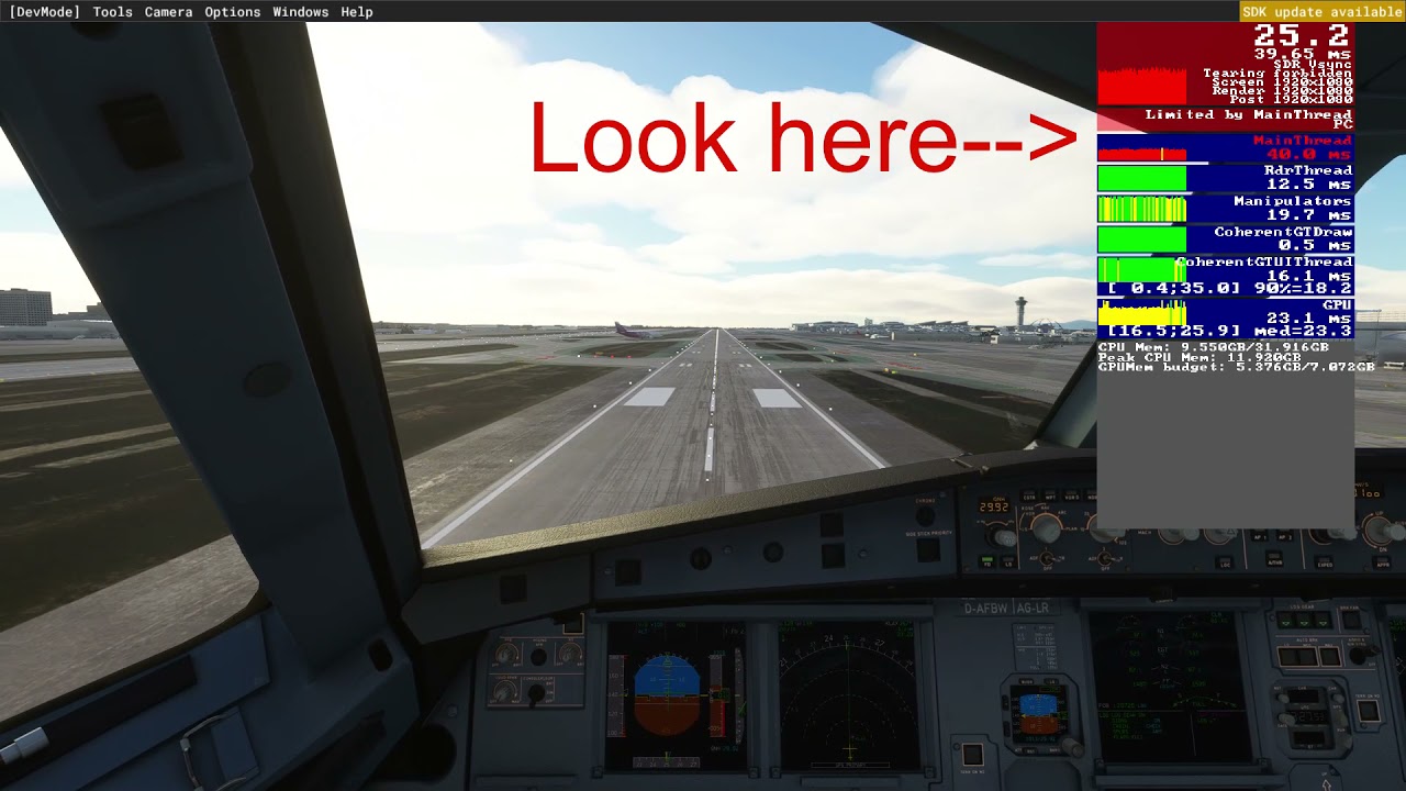 Main thread (mostly affected of terrain lod on ground level) measure should always be yellow (above 30fps) or green (above 60fps) never red (below 30fps) same with GPU (mostly affected by resolution or flying in heavy clouds).