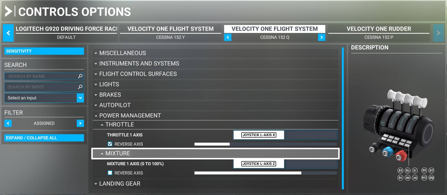 This is what is shown on the Settings screen with my custom profiles, copied from the default Single-Eng. Prop. The black vernier knob is pulled fully out, the red one is fully in, the start up situation on a Cessna 152, notice the throttle bar isn’t at 0%, the mixture bar isn’t at 100%. And the indicated range is fixed at this 25% or so.