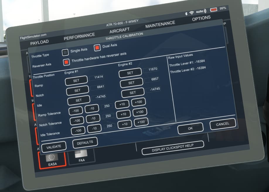 In the aircraft settings (on the tablet left of captain), dual axis is enabled and “Throttle hardware has reverser axis” disabled. If I enable this option, my VelocityOne power lever at idle is seen as full reverse in the sim.