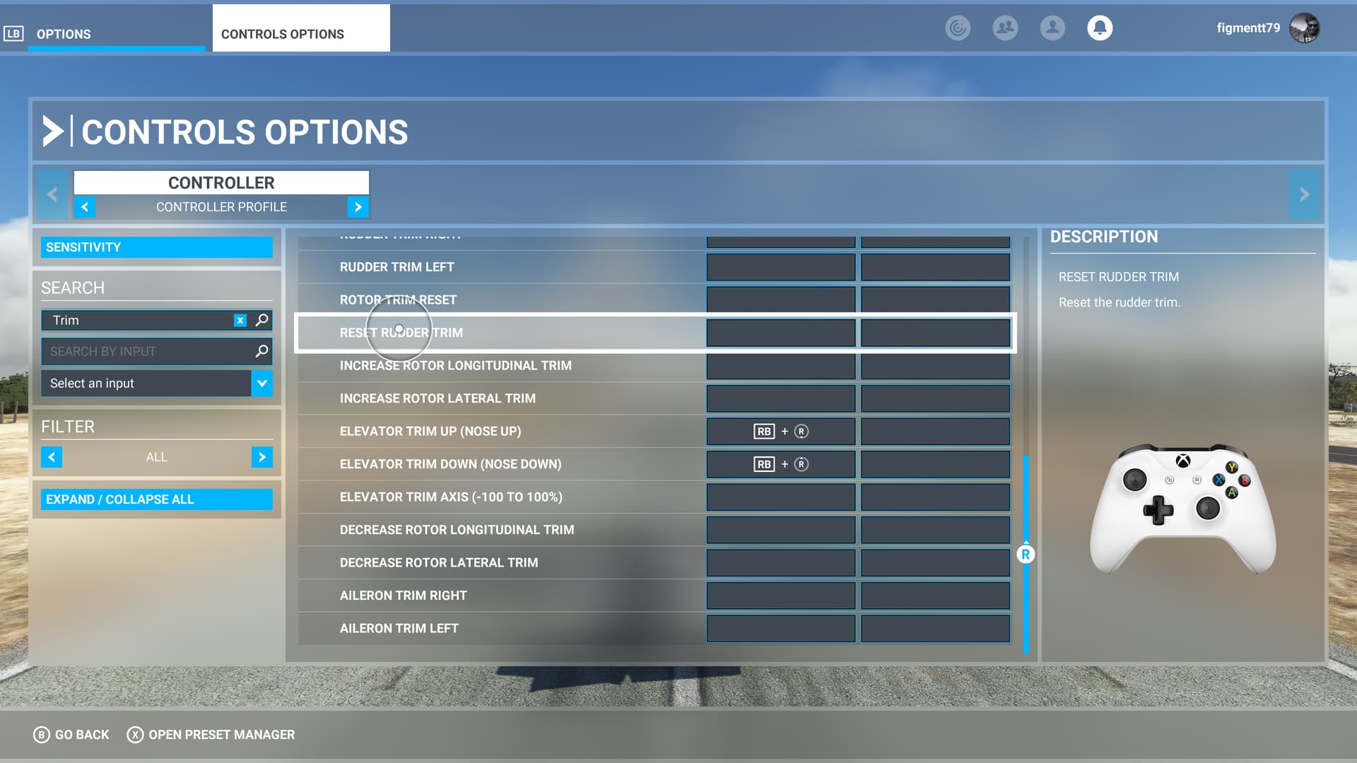 If i was to go back to controlling trim via the xbox controller - can you suggest what is the best control or button on the x box controller for this - and how do you reassign trim from the numpad keys on the keyboard to the nominated option on the x box controller ?