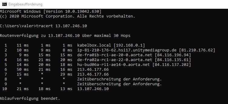 Tracing route to 13.107.246.10 over a maximum of 30 hops