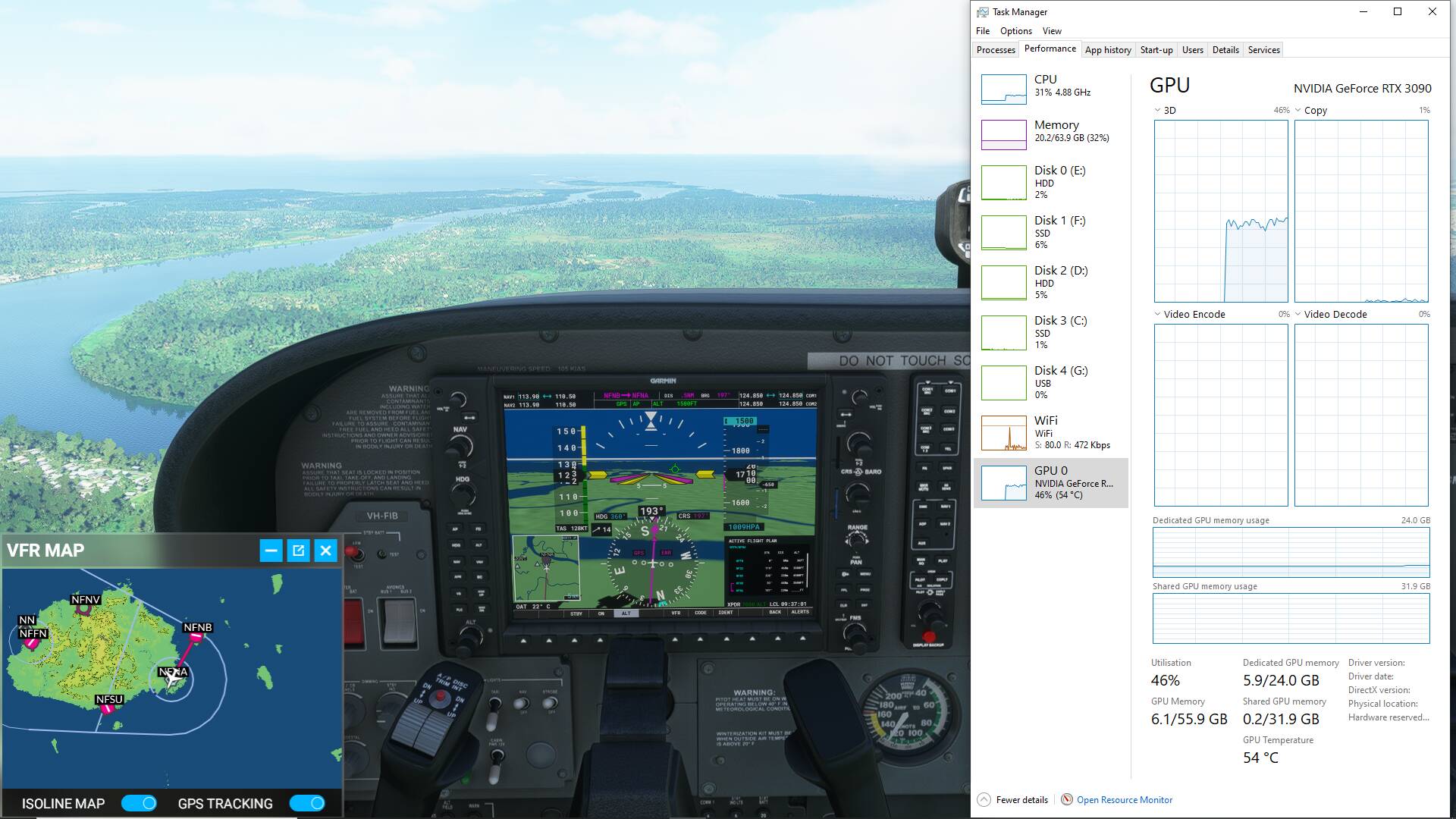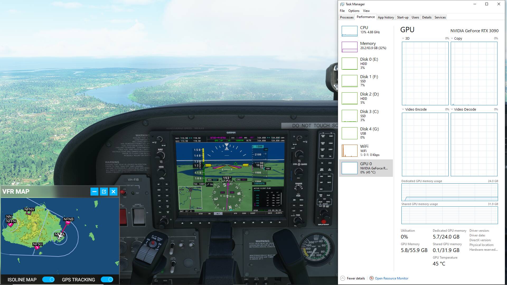 It happened again about a mile from the airport on approach to land. See the shot I took that clearly shows nothing is under stress and the GPU is doing “nothing”. The next shot shows the GPU picking up once the sim continued. The pause was almost 3 minutes.