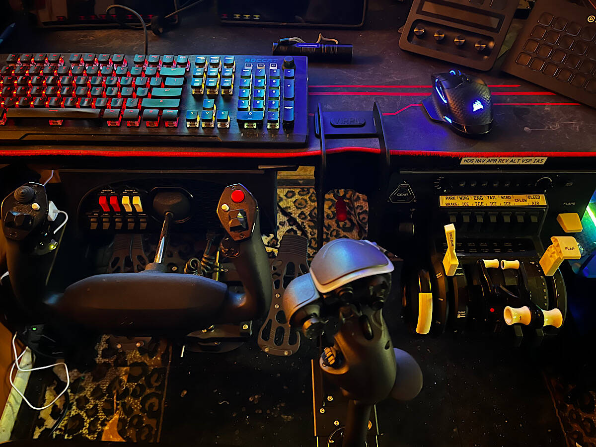 The long desk mount and 200mm extension were easy to install and mount, and put the Alpha Prime in perfect position.  But the desk mount pushes the base away from the desk a LOT.  It’s necessary to get full gimbal travel, but I’ll need to be really careful getting in and out of my chair.  The cockpit got a lot more cramped.