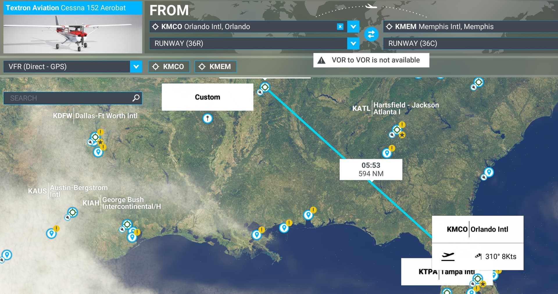 The Memphis area has removed a LOT of their victor airways. The only one available currently comes in from the southwest. From Orlando, you’d basically have to route all the way over to Mobile, Jackson, and then up. There are also a bunch of MOAs you have to work around.