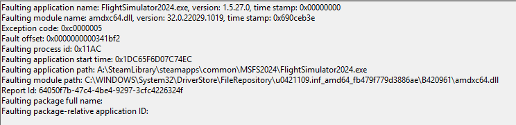 Description of the issue: Whenever I start playing MSFS 2024 in VR, the game crashes before I can even launch a flight. I will be in the menus or selecting an aircraft and it will just CTD. I think this is a crash related to the amdxc64.dll driver with RX 7900XTX. I’ve reinstalled drivers and it hasnt’ helped. All other VR games run fine, this is a Microsoft issue.