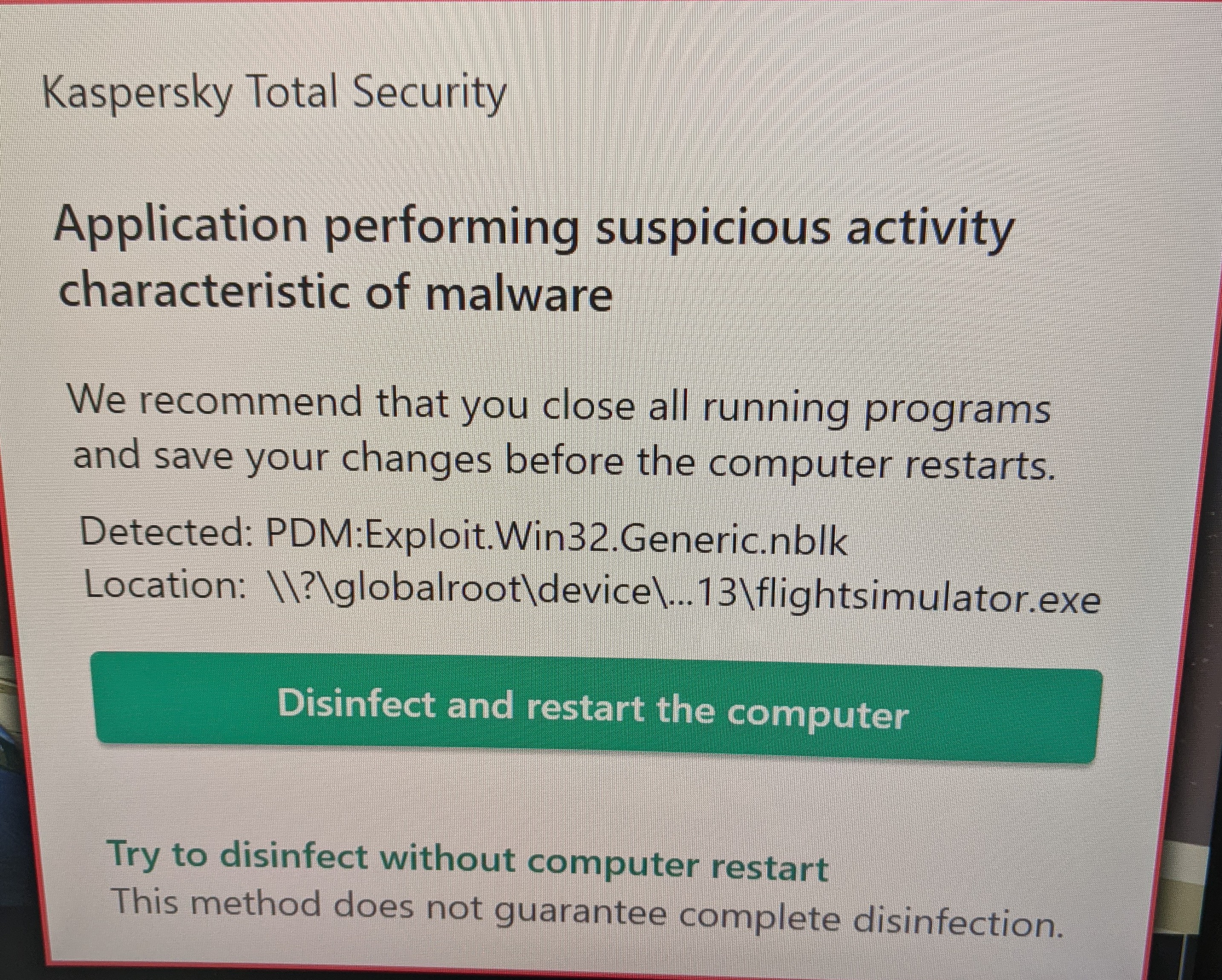 Kaspersky offers two options: “Disinfect and restart” or “Disinfect without restart”. Both of these mean that the flight simulator can no longer be started.