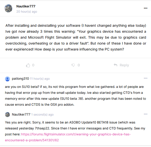 I’ve had about 5 of these today, even with an empty community folder. My GPU isnt overclocked, it’s not overheating, and my drivers are fine.. Everything was running fine, no CTDs, until the last update.. So to say, oh this is just the new way the sim reports a CTD is rubbish…