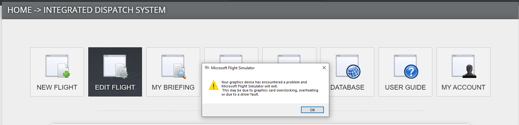 I started a flight and was about 3 h in the air. Then I got the error with the message “Warning: Your graphics device has encountered a problem”.