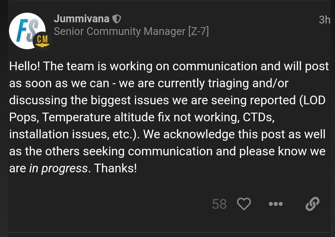 Annoying as it is, often times the best thing to do is say nothing and figure out what’s going on. Asobo as no doubt been aware of the huge wave of negative feedback. Knowing that just rolling back is the wrong move (and likely impossible at this stage) they are probably looking at each primary issue and figuring out what is a bug, what is a feature request, what is user error, what is universal vs conditional, what was intentional versus unintentional, writing user stories for engineers to solve the legit bugs, reviewing code changes for missed errors, working on some level of statement, and overall just figuring out how to move forward.