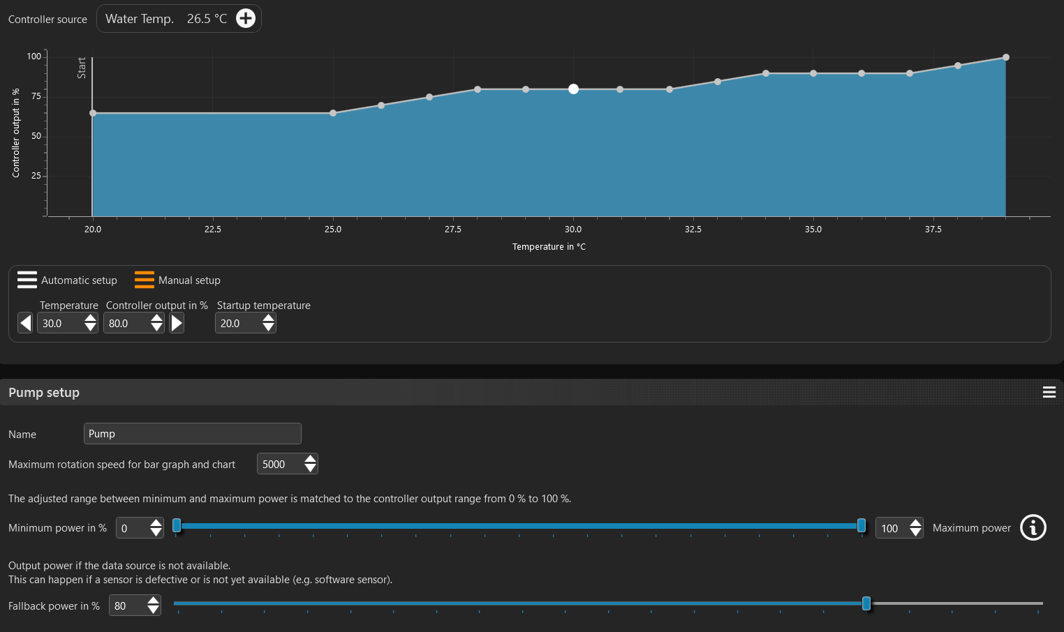 I set the water pump to a curve (stair case) based just on water temp. Having used the PC for 6 months or so, the water temp has never been above 35, here’s the curve: