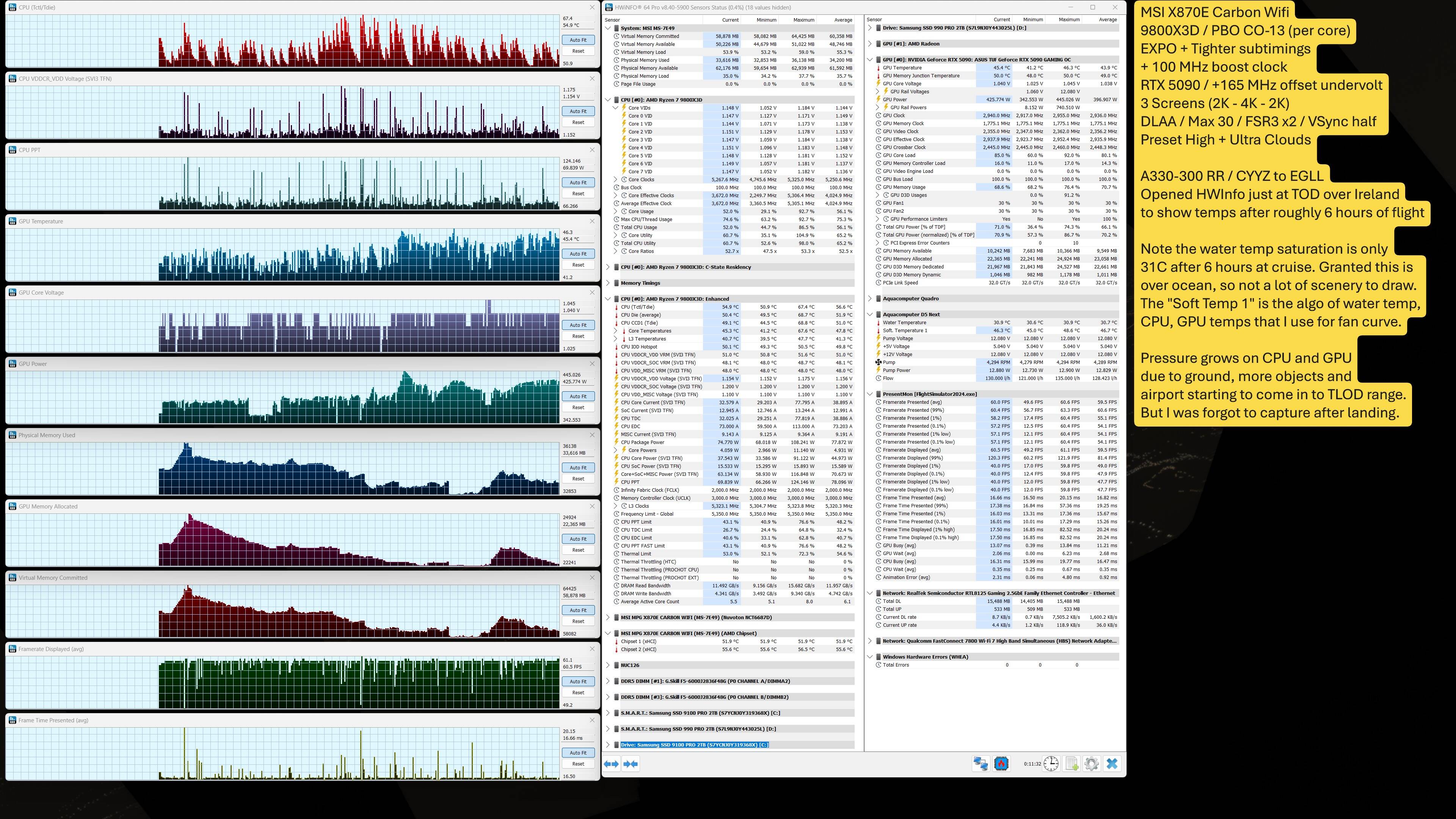And finally, here is the result, I opened HWInfo just at Top of Descent, capturing down to Initial Approach, having flown 6 hours from CYYZ to EGLL in the default A330-300. Water temp saturation is only at 31 C. It rose a bit on landing because CPU and GPU temps rise with all the TLOD work when landing, but stayed below 33.