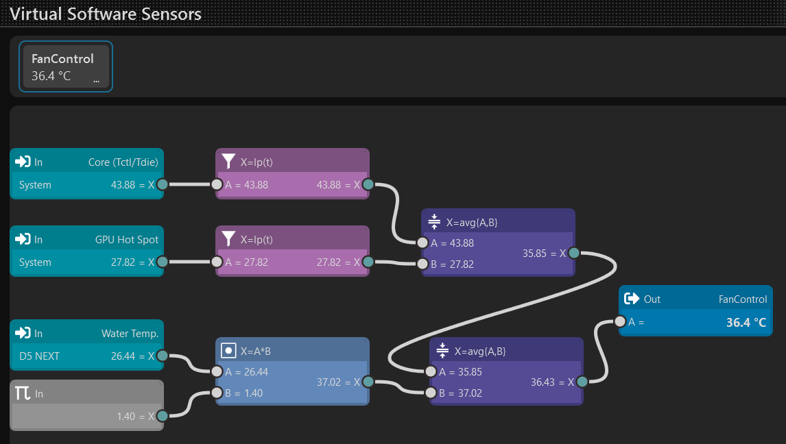 Finally, the magic is to average the 3 numbers together, such that if any of them rise, the Fan Control number goes up, controlling the fan curve. Also, since I’m multiplying the water temp x1.4, when water temp rises it has an amplified effect on the fans - which I wanted, since the fans cool the water in the radiators. It was trial and error but works great.