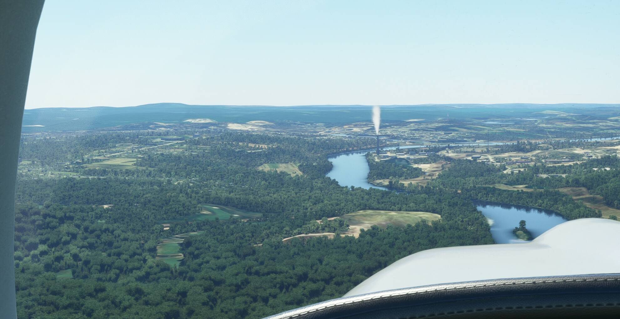 Granted, the pics are using my addon too, but the real star is the the “We Love VFR - Region 2” addon which added the smoke stacks that are just south of KCON and are a major landmark around the airport because they are always smoking (plus of course many other immersion inducing landmarks). The real life pictures were taken on a flight from KCON to KMHT earlier this year.