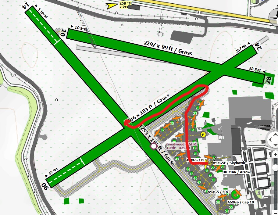 I just took another shot at Goodwood. This time I got LittleNavMap involved which clearly shows the intended taxiways to use to arrive at the entry point for runway 24. I used Parking spot 19 and anounced my intention to taxi, turned the plane through 180 degs, no taxi ribbon available. Stopped just short of the runway entry point, announced my take off, entered the runway turned 180 at the end and took off.