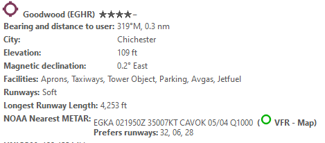 This to me is a major issue for un-towered airports. If you want to use live weather and hence take off from the logical runway choice for the weather conditions, and you want to start on a ramp cold and dark, you will have to accept that unless the weather happens to agree with MSFS’s choice of runway (which for Goodwood happens to be the longest runway and not the runway most frequently used IRL) then it won’t be logged as a take off.