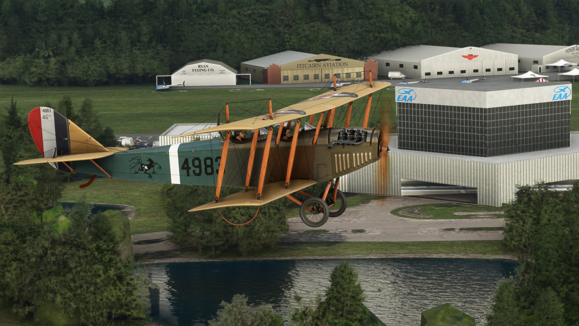KOSH thanks to the PilotEdge scenery and other add-ons. You can do pretty much everything there, with large east/west and north/south runways for getting big stuff in and out. There’s a nice grass strip with a vintage airport, a STOL competition/ultralight strip, and even a water runway and seaplane base. The adjacent photogrammetry is pretty high quality too. It looks pretty close to real.