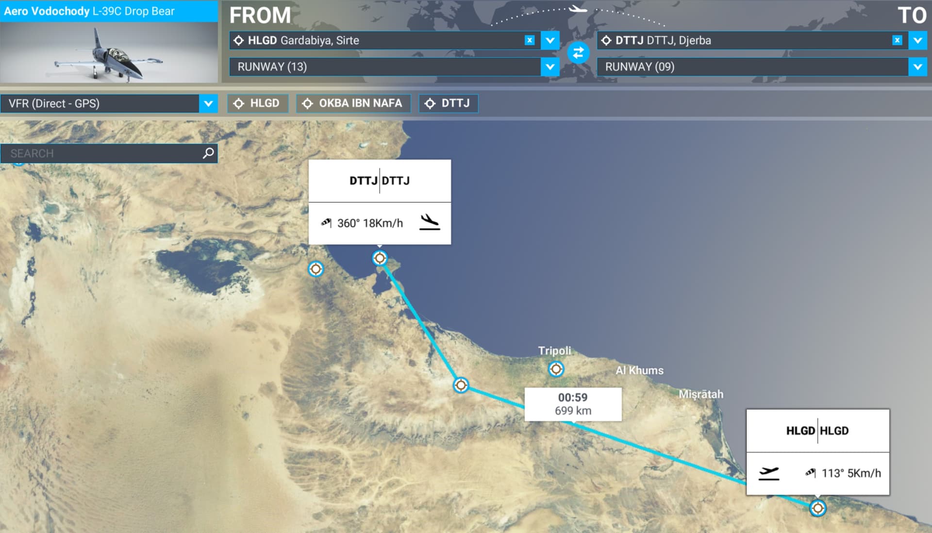 Flew from Gardabiya (HLGD) to Zarzis-Djerba (DTTJ) with an added waypoint to keep the route over land.