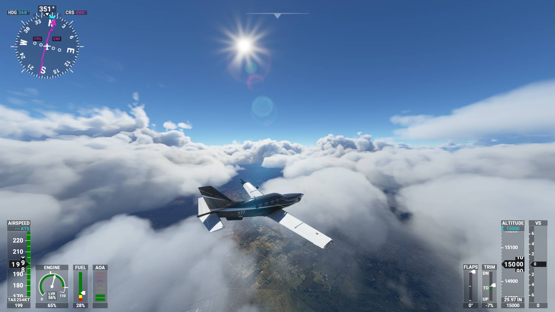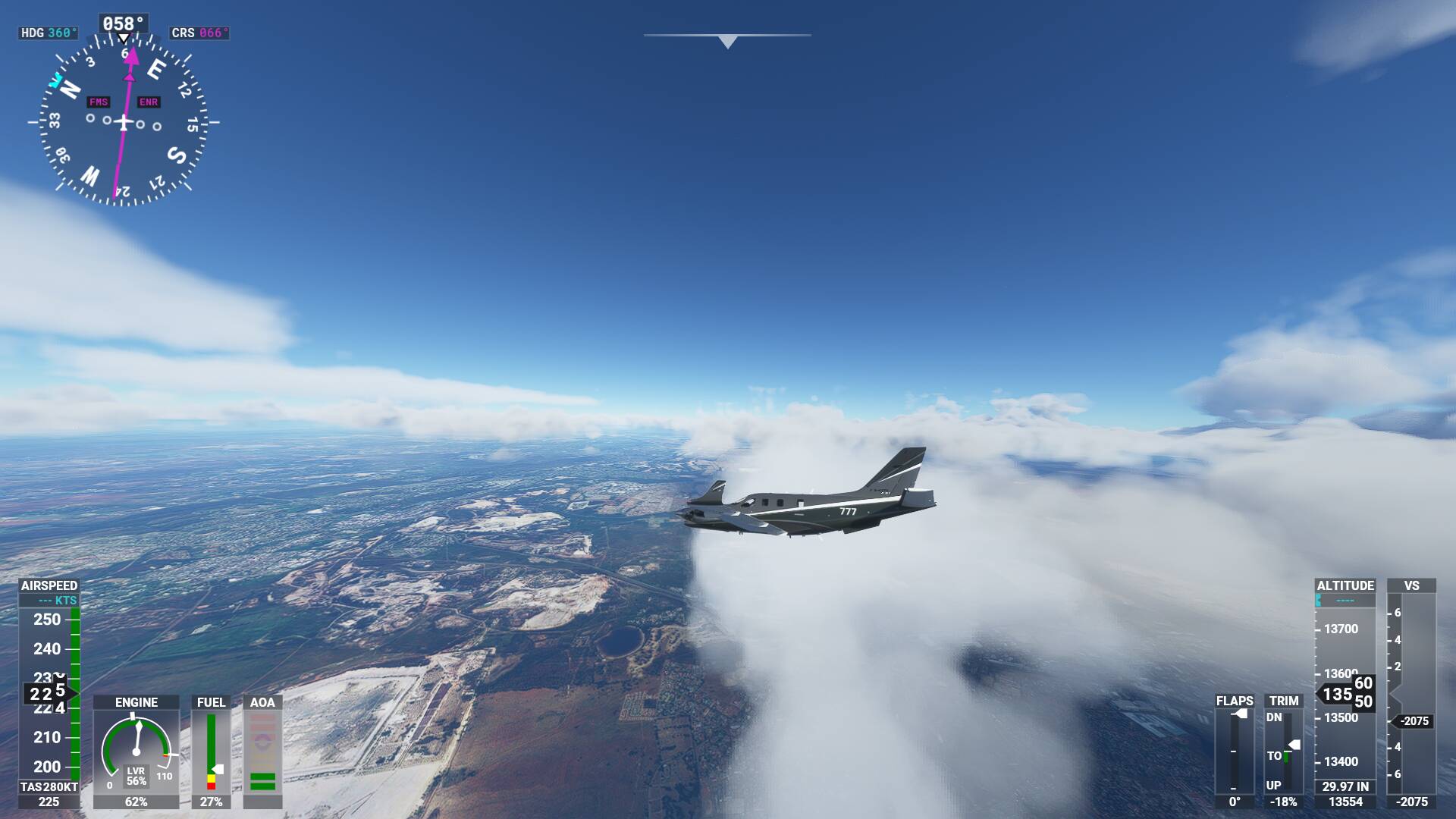 I checked out the location of the Halloween challenge in free flight with the amazing C152X mod and spawned an hour before sunrise in pitch black IMC high above the field… I managed to get out of the mountains to Bucharest to watch the sun rise. Now that the sun was up, I headed back up to Transylvania through the clouds and flew through a cloudy canyon up to a high mountain lake. Just above the ground, visibility is sufficient to sort of make out where the rivers flow!