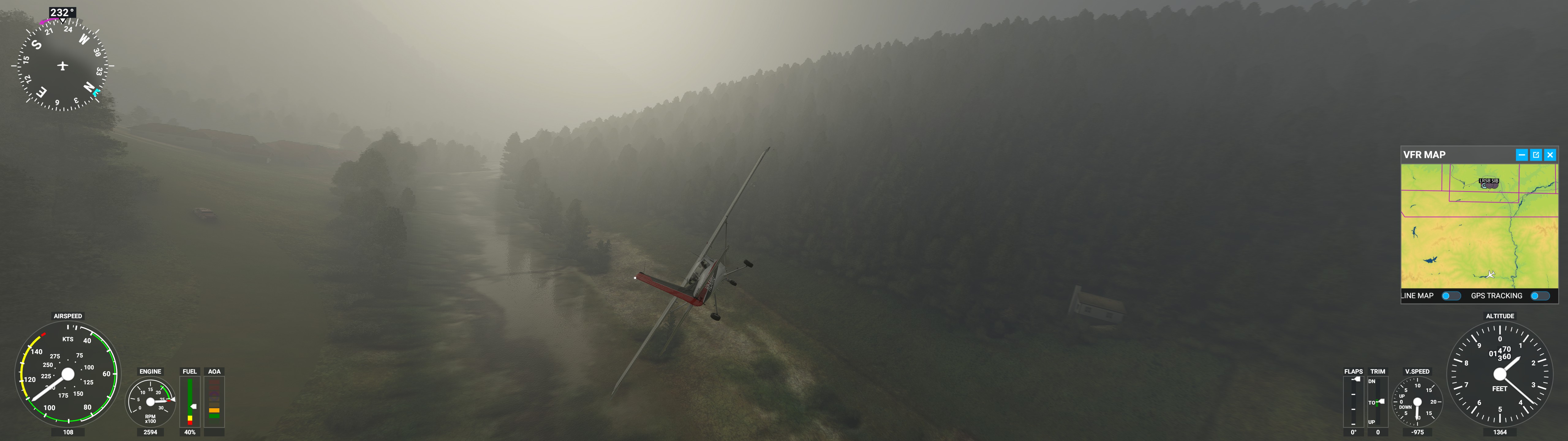 THIS is where this sim truly shines!!! Down on the deck at full throttle carving through a snaky river canyon enveloped in mist, dodging tall trees and flying just high enough to see where the next bend is heading… Soar too high and ground visibilityis lost…