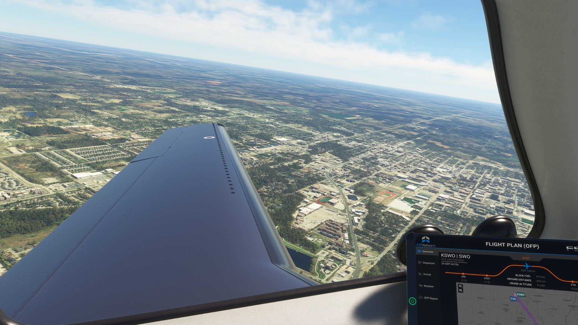 Charter flight from Sweetwater to Lake Charles. Clear skies, although a good deal of turbulence on the way down. Loving the FSR M500!