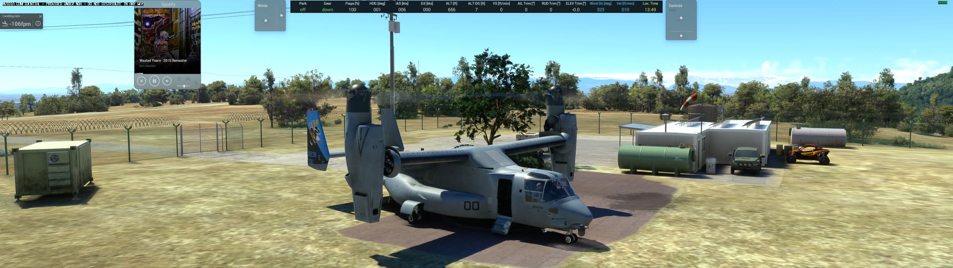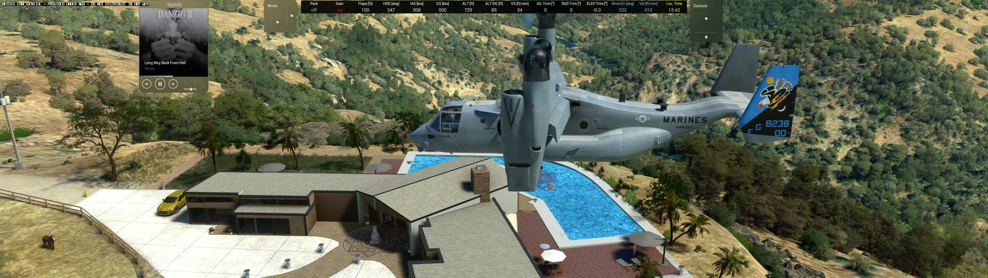 Trying out the MV-22. Lots of nice functions. More challenging than the FSX/P3D Osprey. Found out the hard way about that vulnerability to stall. Have made sure not to repeat that mistake.