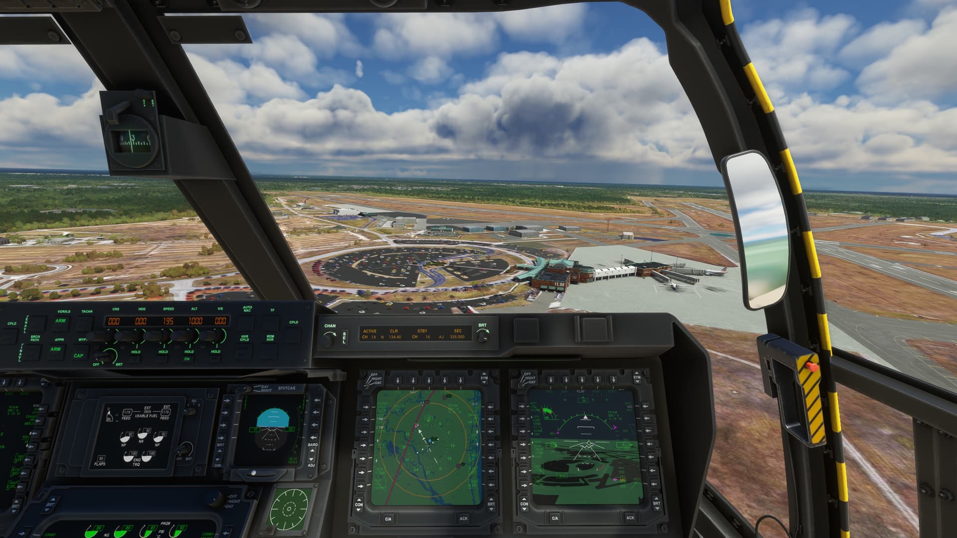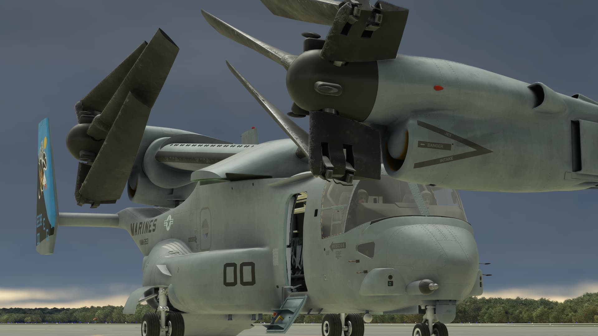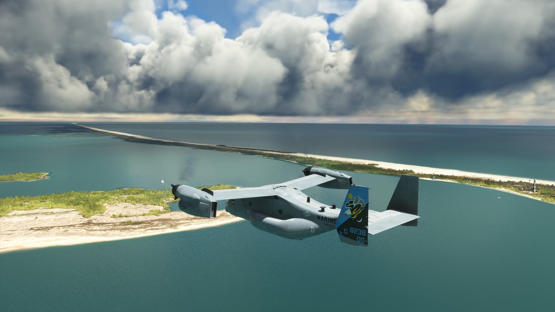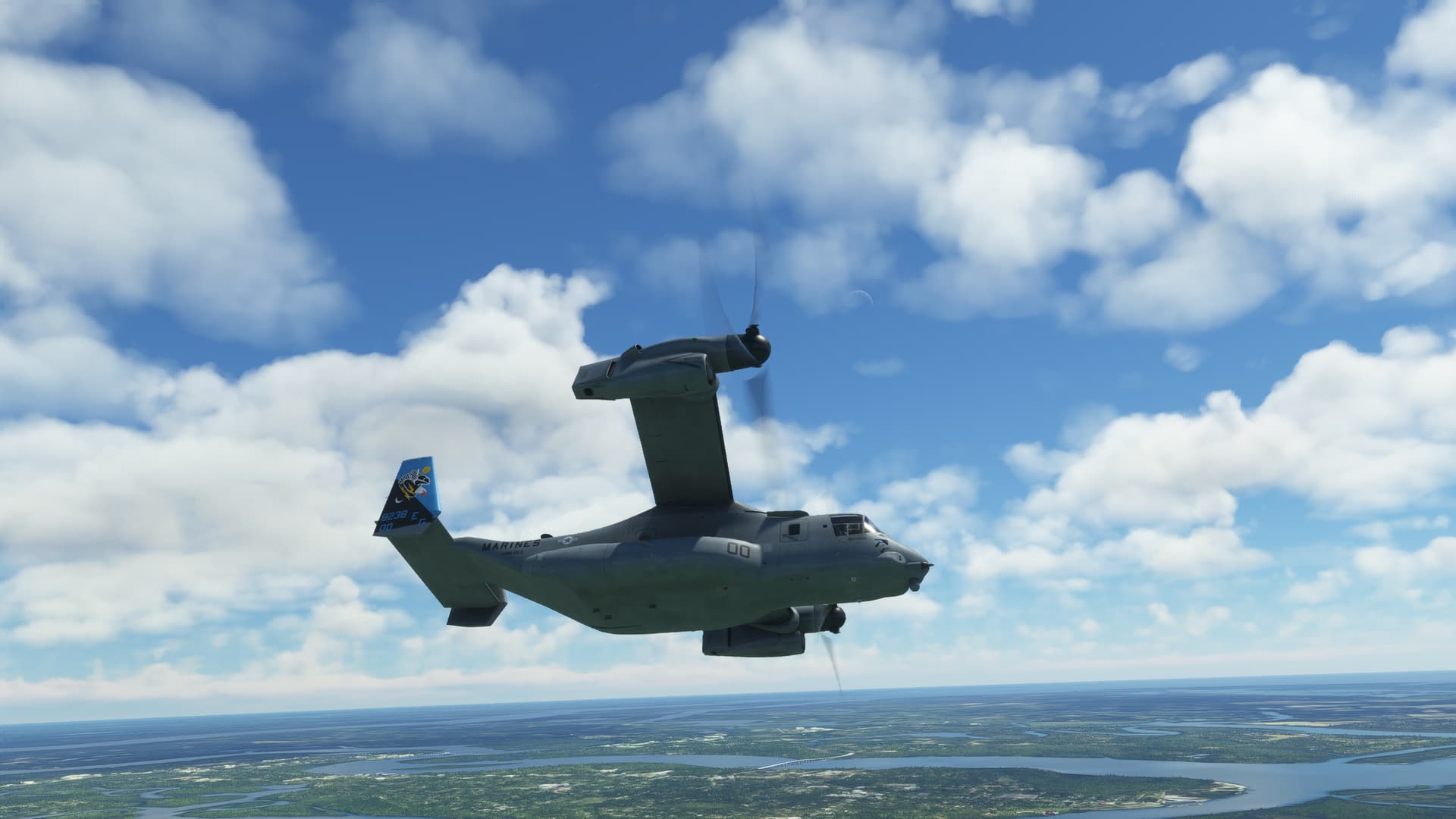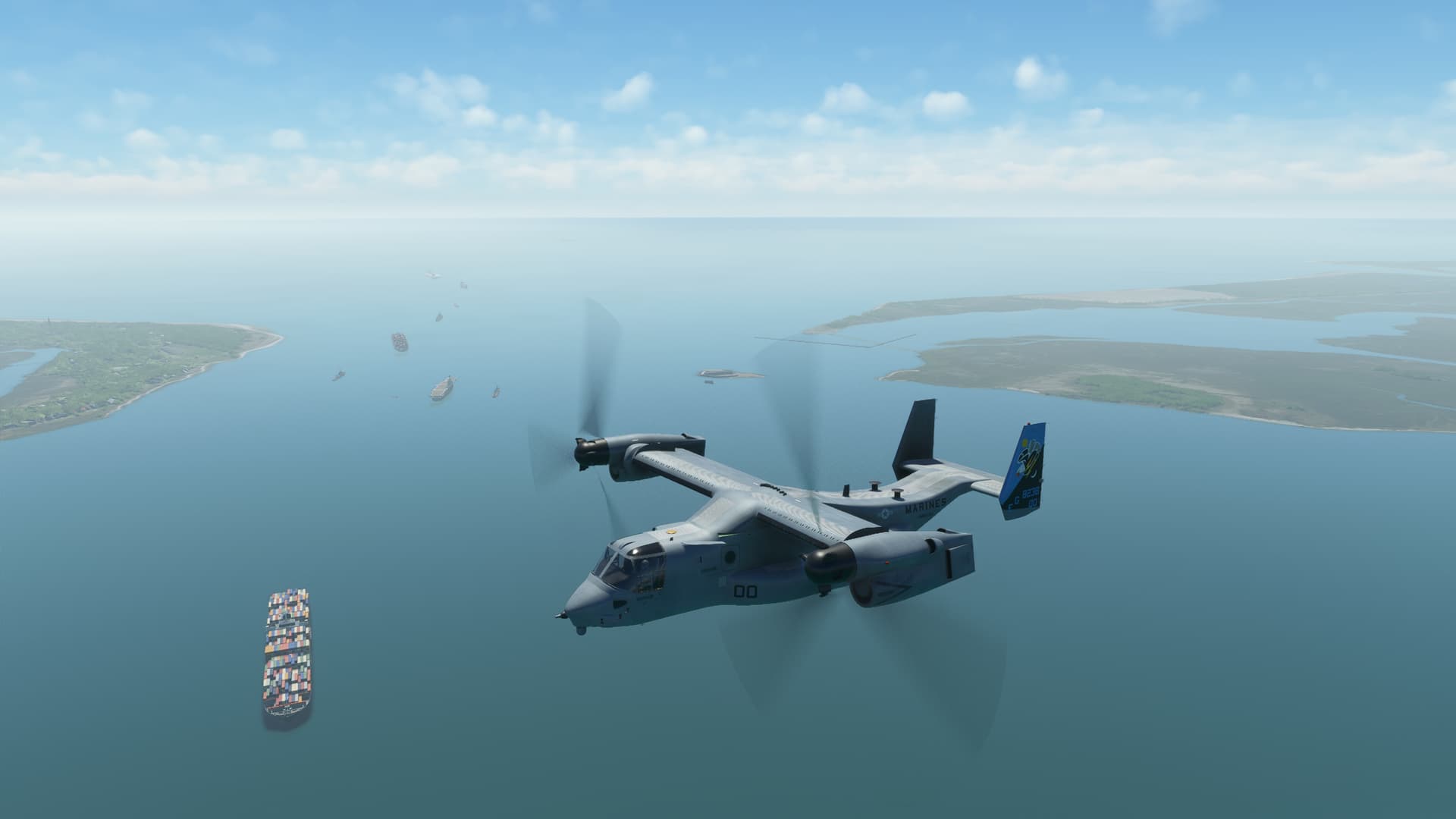 So, after practicing around Port Royal (Beaufort MCAS), I dared to go on a much longer flight up to NAS Oceana. Passed where US aviation was born at Nags Head. With the realistic turbulence on the Osprey was a handful, even with the autopilot. Getting better with most systems, but forgot to turn on the prop lights, realizing when almost into Norfolk. Pre WU13.