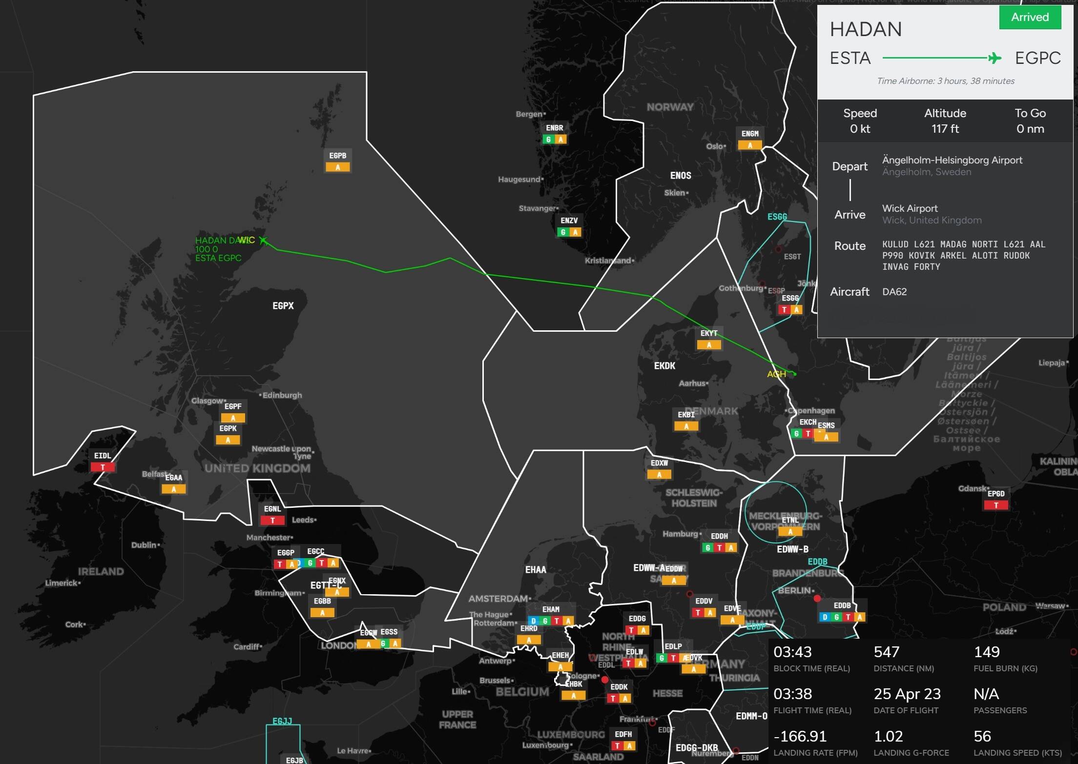 Did the third leg of Micke Lange’s DA62 atlantic crossing: Ängelholm (ESTA) to Wick (EGPC):