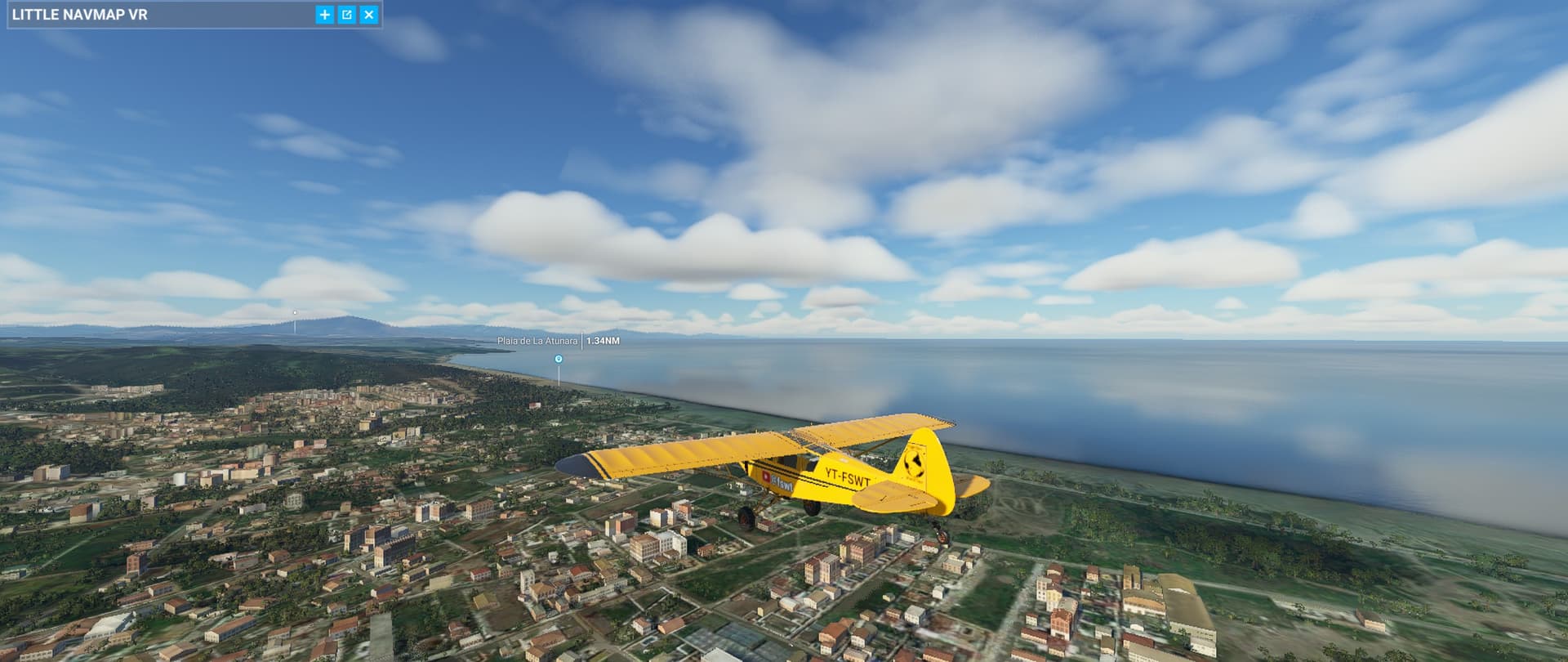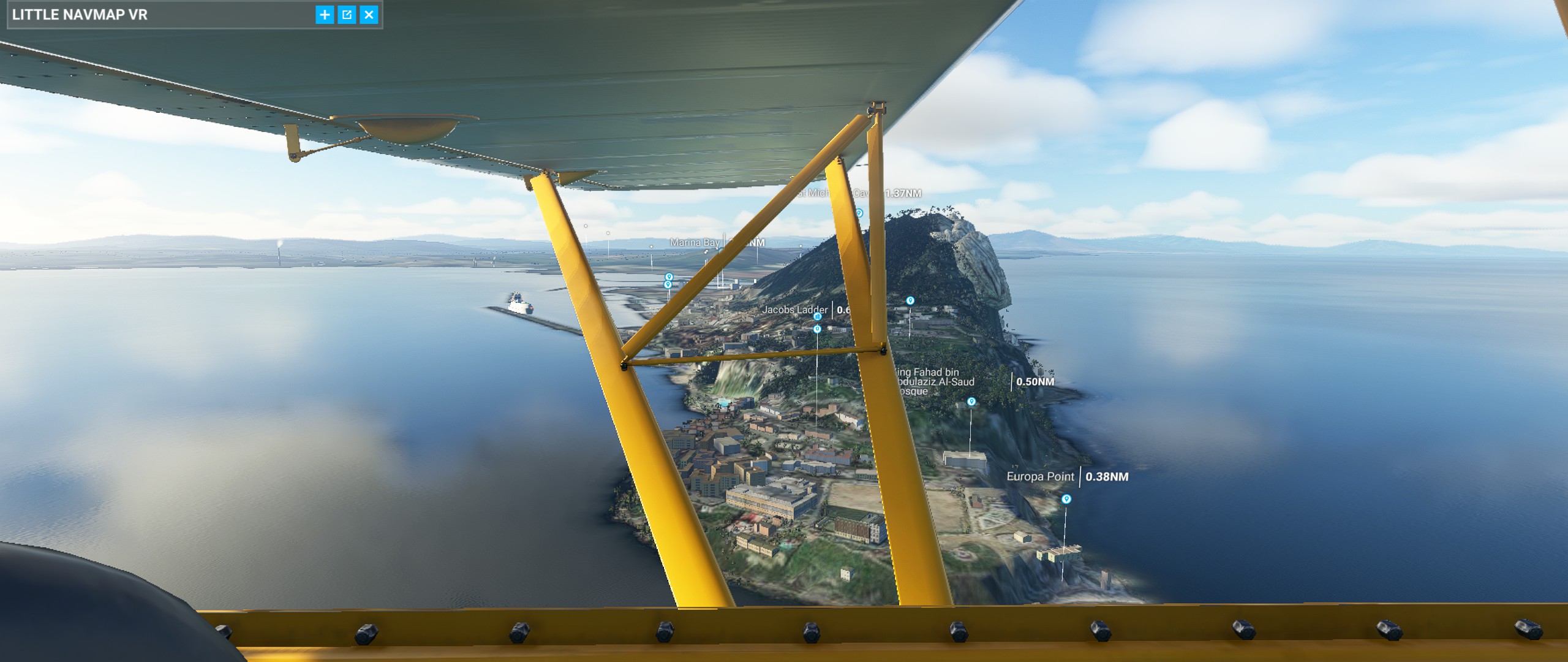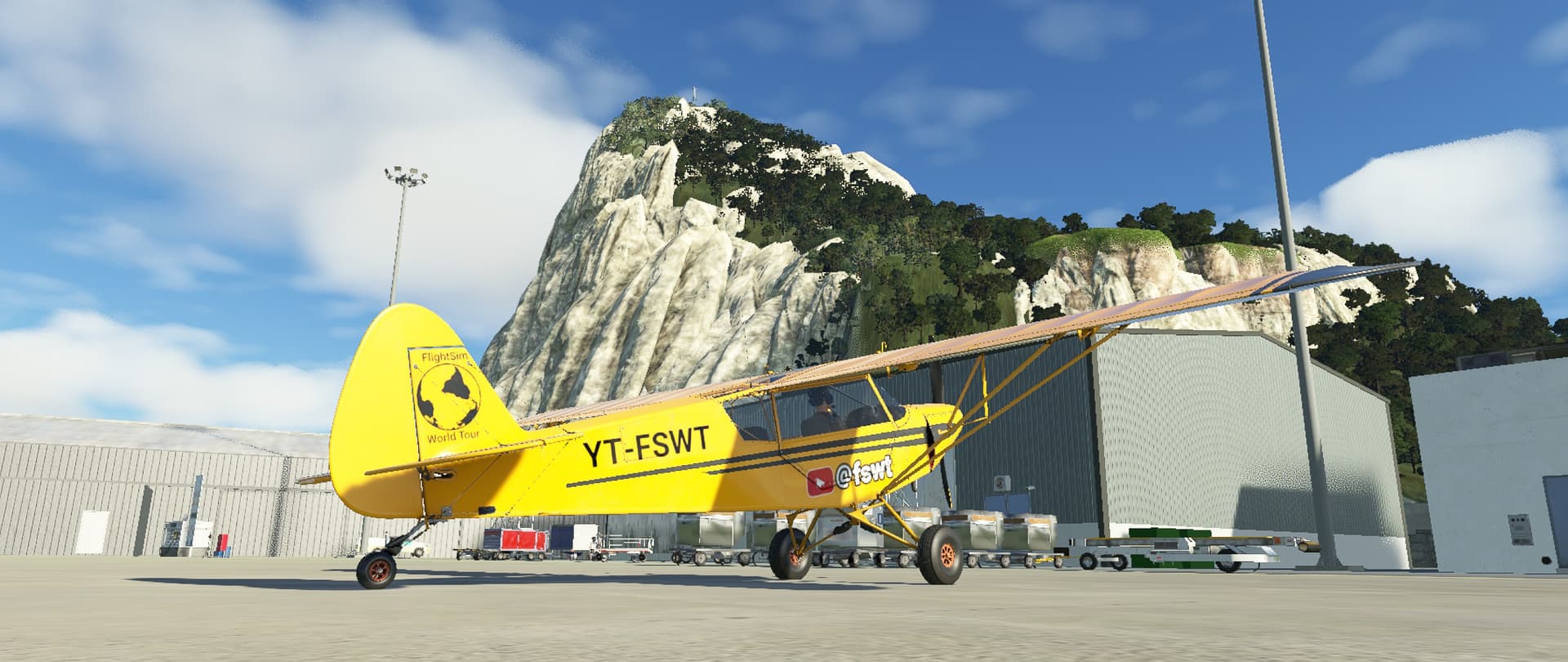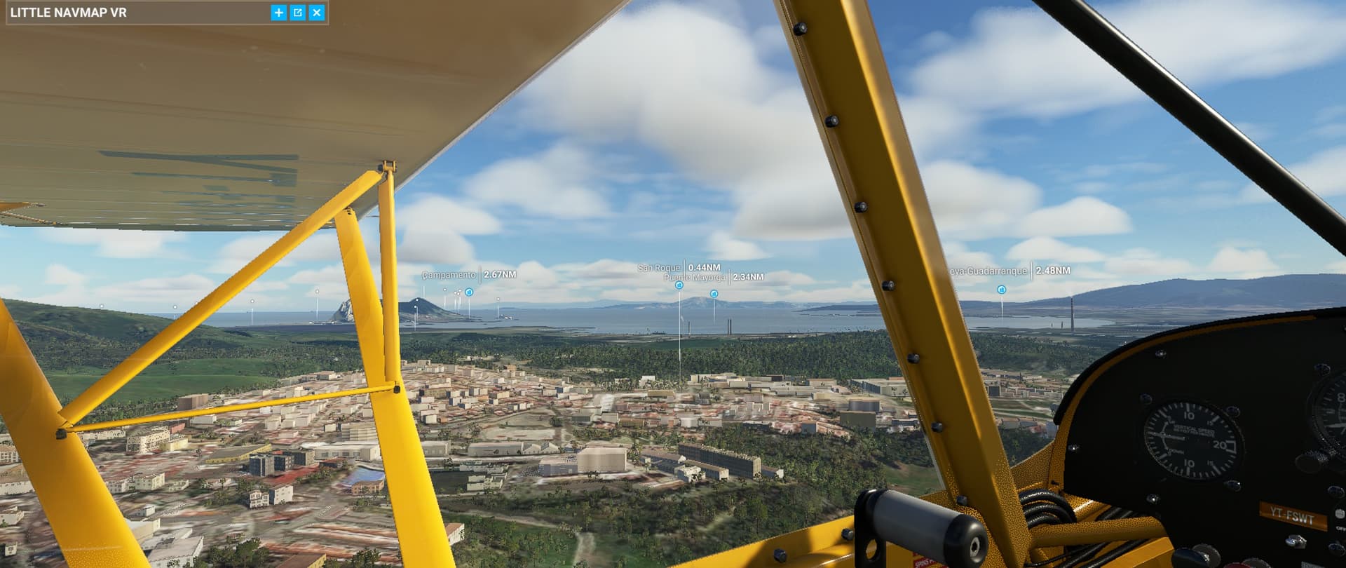 Had a panoramic flight by Gibraltar (LXGB) on a Savage Cub and tested a new weather preset. It was a short flight, only 21 minutes, with a very, very short take-off (I had not fully centered the elevator trim). It’s a beautiful place, with an impressive massif just south of the airport, and I doubt that there is something like a left pattern for runway 27, which the air traffic control asked me to do. ![]()
