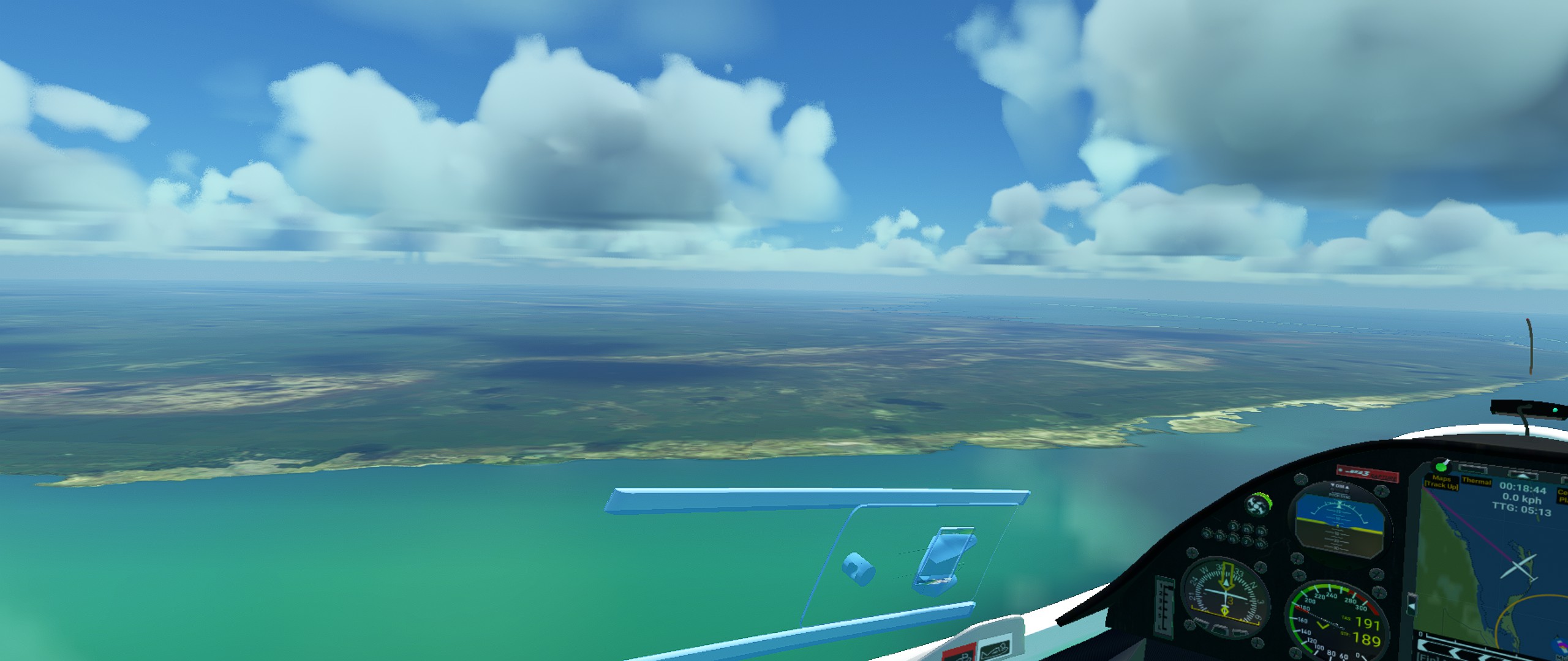 Once up and pointed back at the short dirt runway, I kept the speed at the approach speed listed in the POH for short field and started praying. The water was like glass so I couldn’t get a good height reference, but I kept the nose pointed at the start of the sort-of runway. VR makes runways blurry so I was trying to judge my descent and speed and yelling “CinnamonInk8010 You xxxx”.