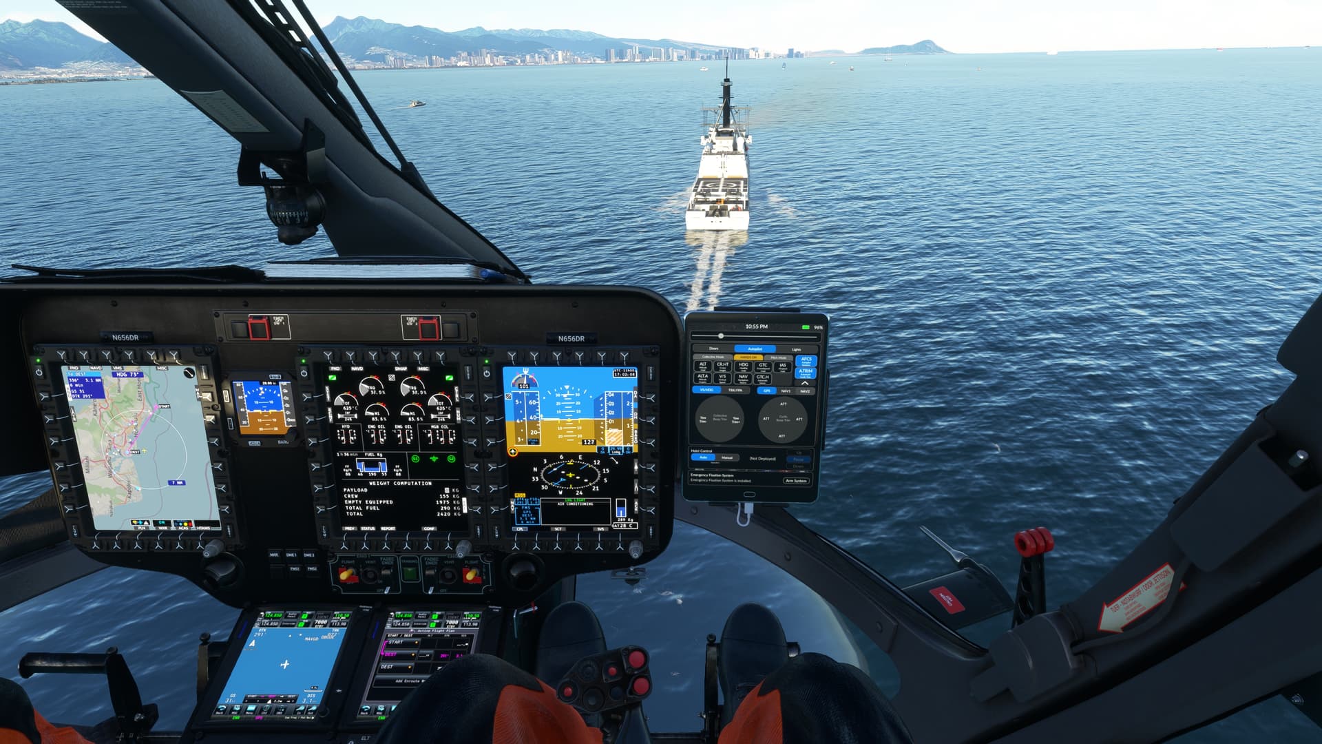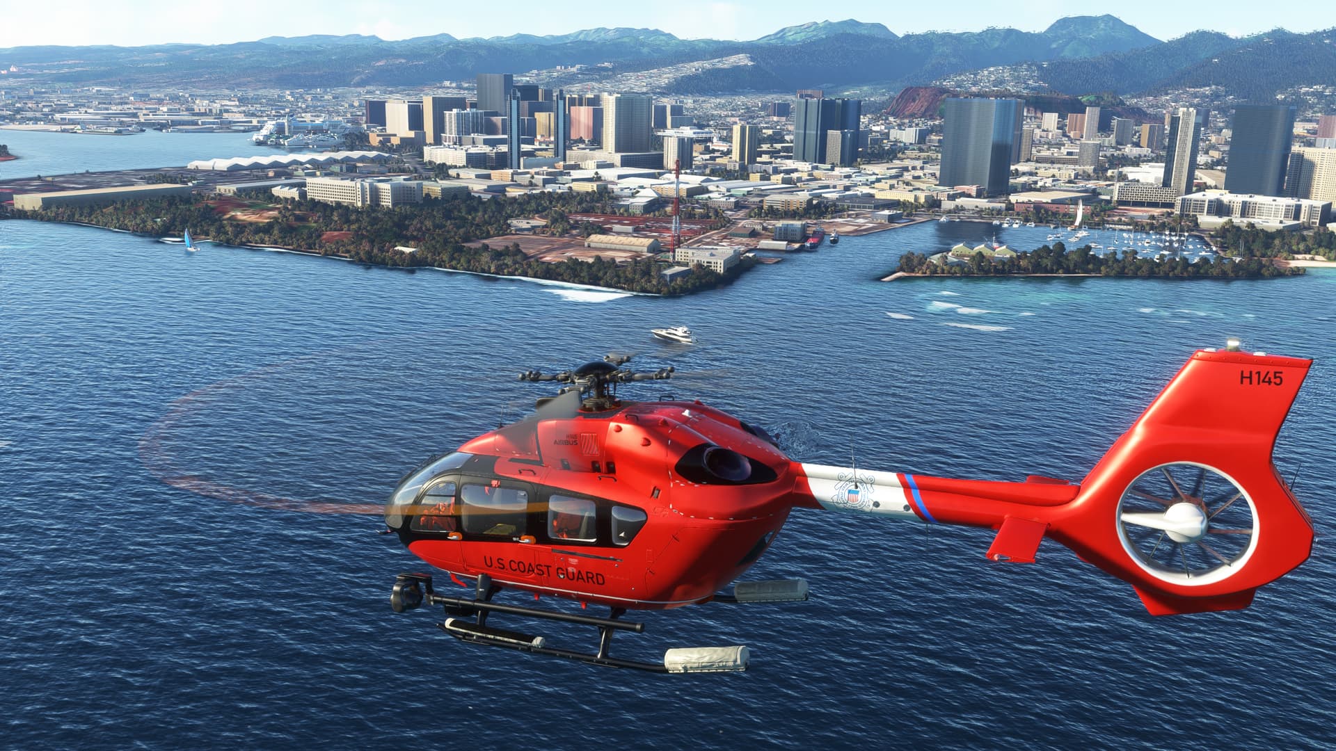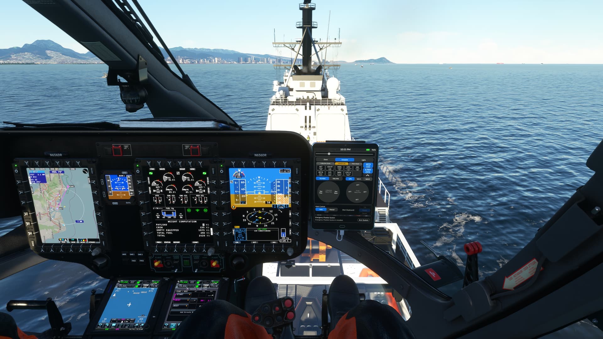Had a much more interesting time in Maunalua Bay. Hopefully, someday, someone will make a proper USCG station at Kalaeloa Airport. Anywhoo, using the right 145 type, I could use the Ponyboy mod to have a dramatic rescue. After finishing that mission, I decided to land and finish on the moving Coast Guard cutter at Sunset. Aloha.