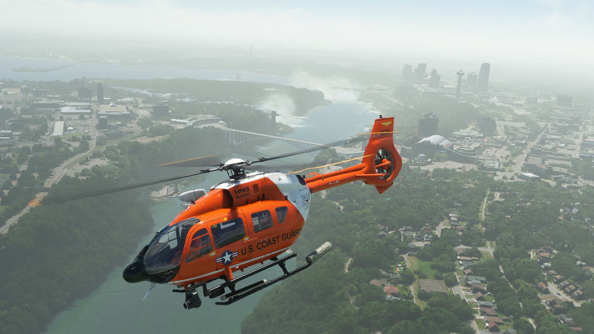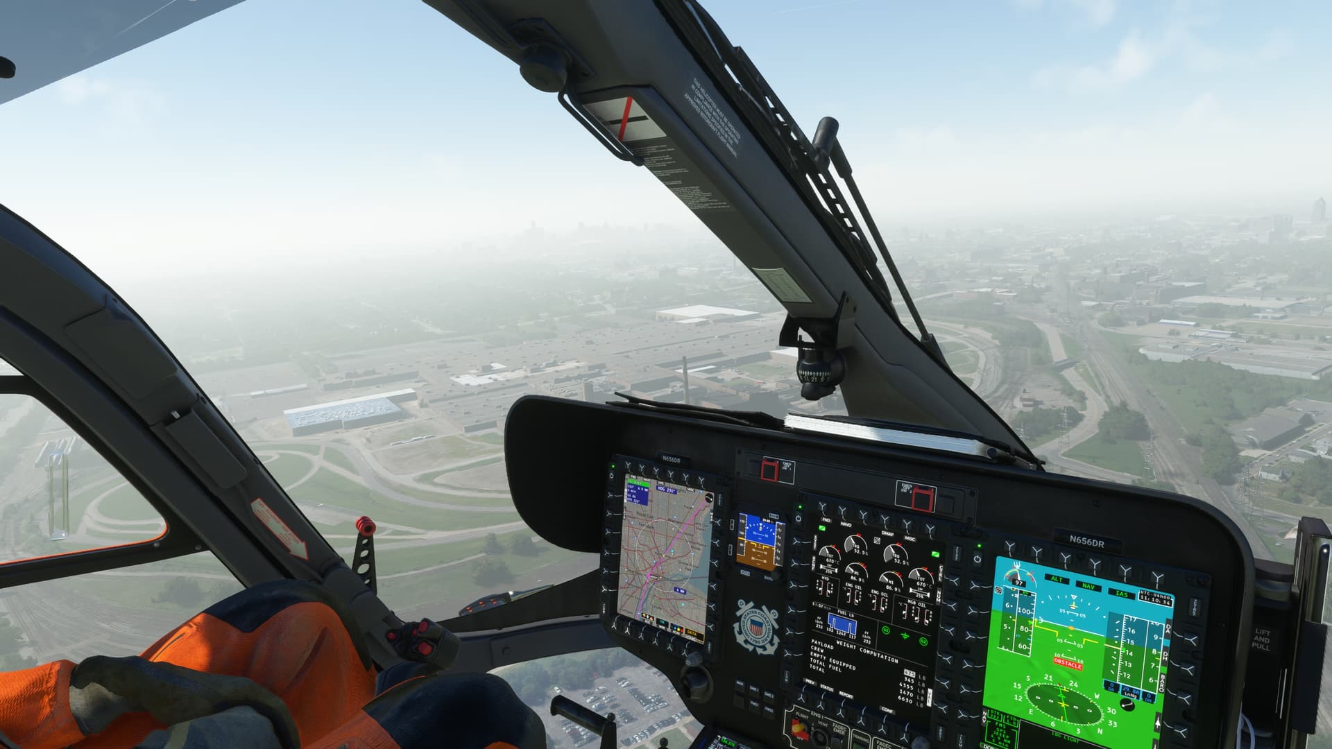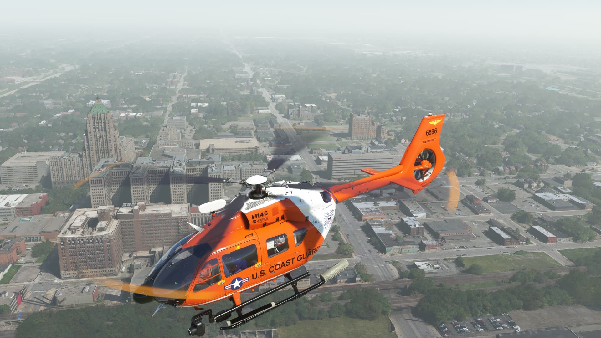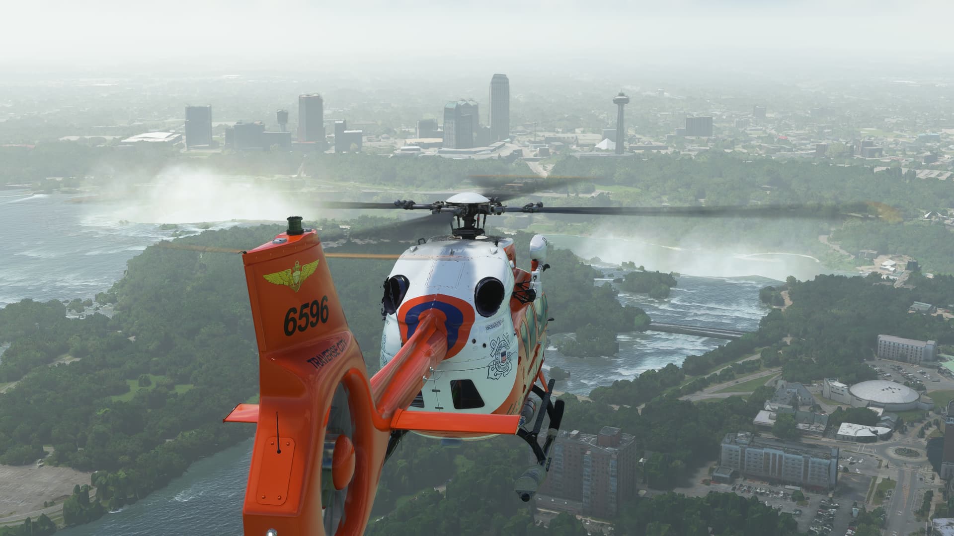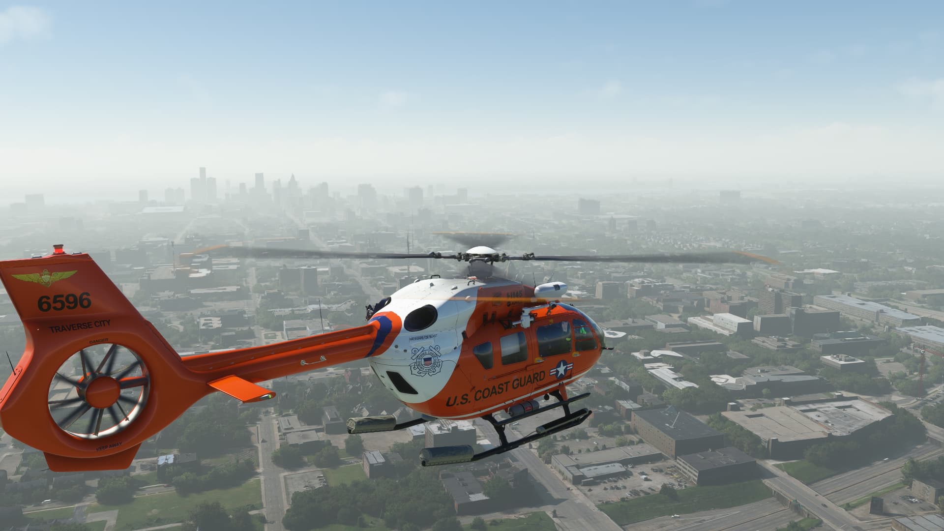 Flew the USCG add-on livery for the Great Lakes, but realized that I could do not sea rescues - livery only works with the HEMS and the sea rescue mod only works with the Off-shore model. Ah, learning experiences. First time in Detroit, flew to see how Fort Drum has been updated. Great weather, but the haze - those Canadian wildfires still affecting air quality.