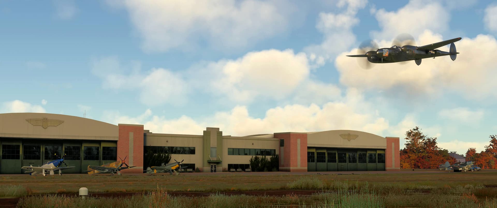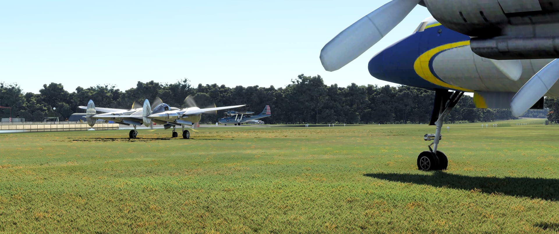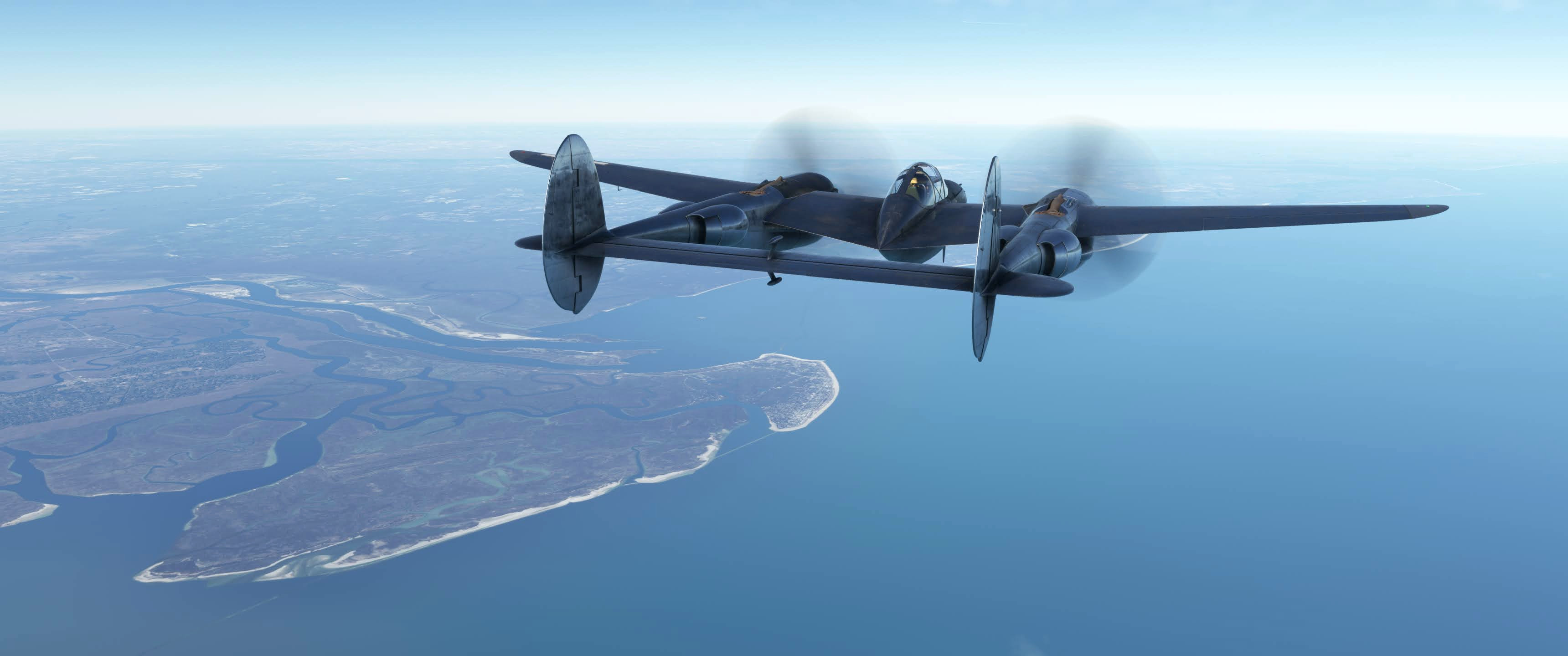 I took the Lightning on her first long-distance outing today, flying from Kermit Weeks’ Fantasy of Flight museum (FA08, scenery by Emerald Scenery/rotornut44) to Jerry Yagen’s Military Aviation Museum at Virginia Beach (42VA, scenery by i9simulations). My plan was to experiment with the airplane’s performance and compare to real world data, so I elected to remain VFR at 17,500 feet and below.