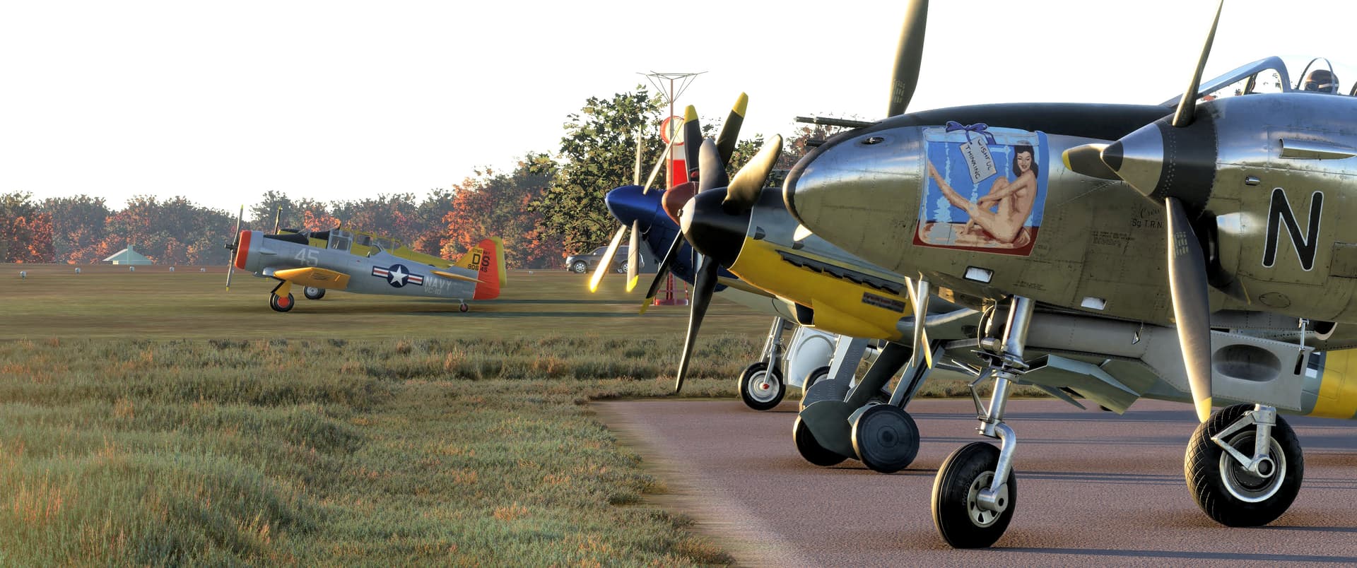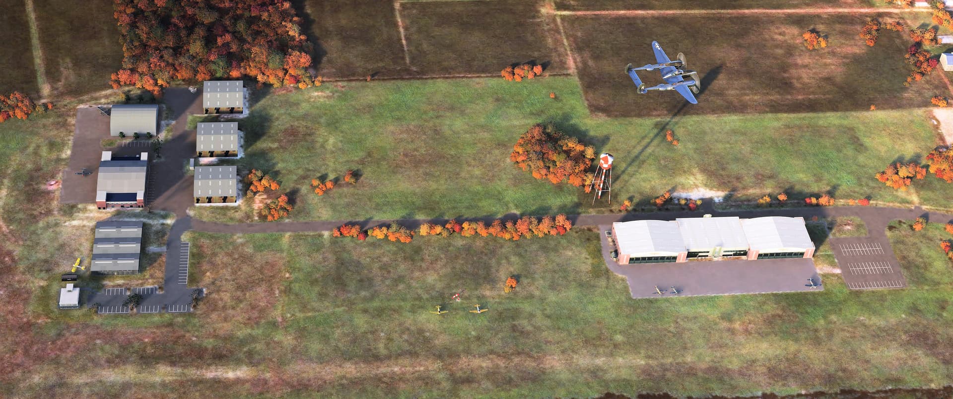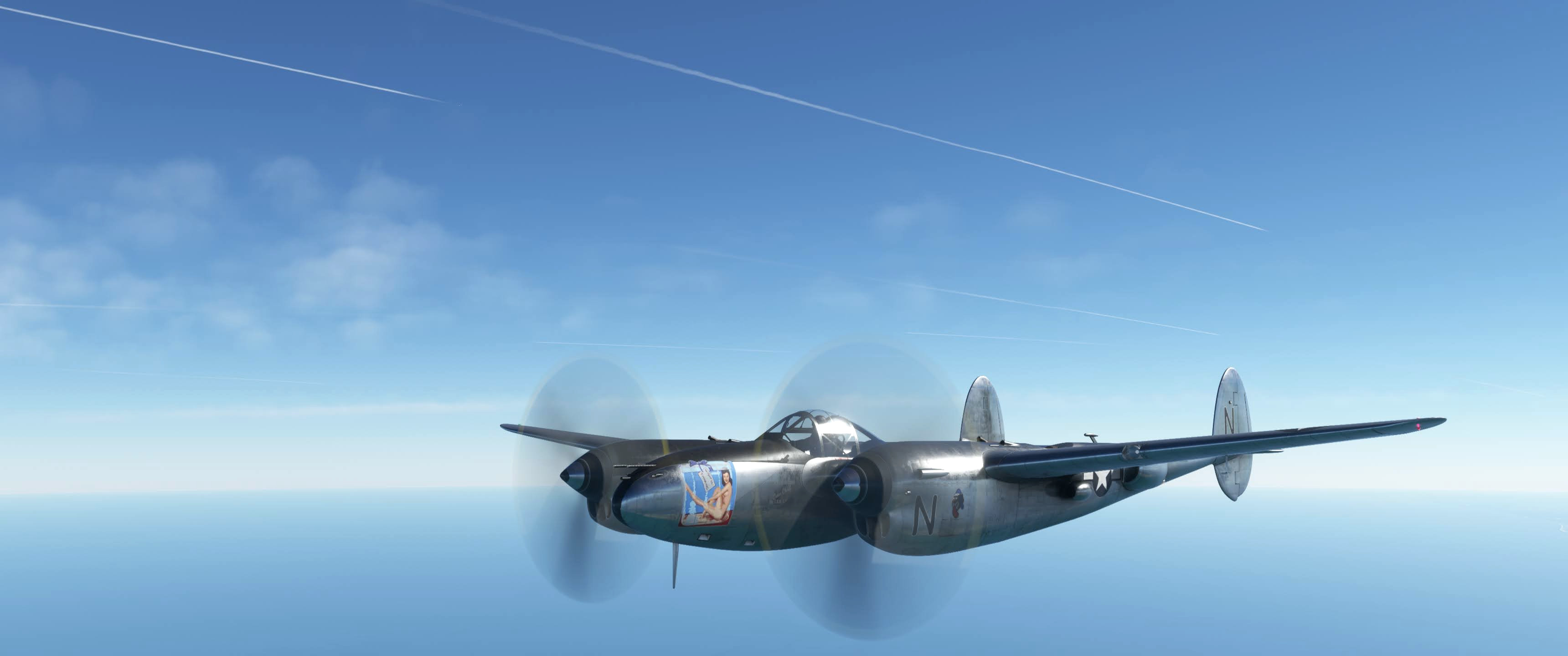 I took the Lightning on her first long-distance outing today, flying from Kermit Weeks’ Fantasy of Flight museum (FA08, scenery by Emerald Scenery/rotornut44) to Jerry Yagen’s Military Aviation Museum at Virginia Beach (42VA, scenery by i9simulations). My plan was to experiment with the airplane’s performance and compare to real world data, so I elected to remain VFR at 17,500 feet and below.