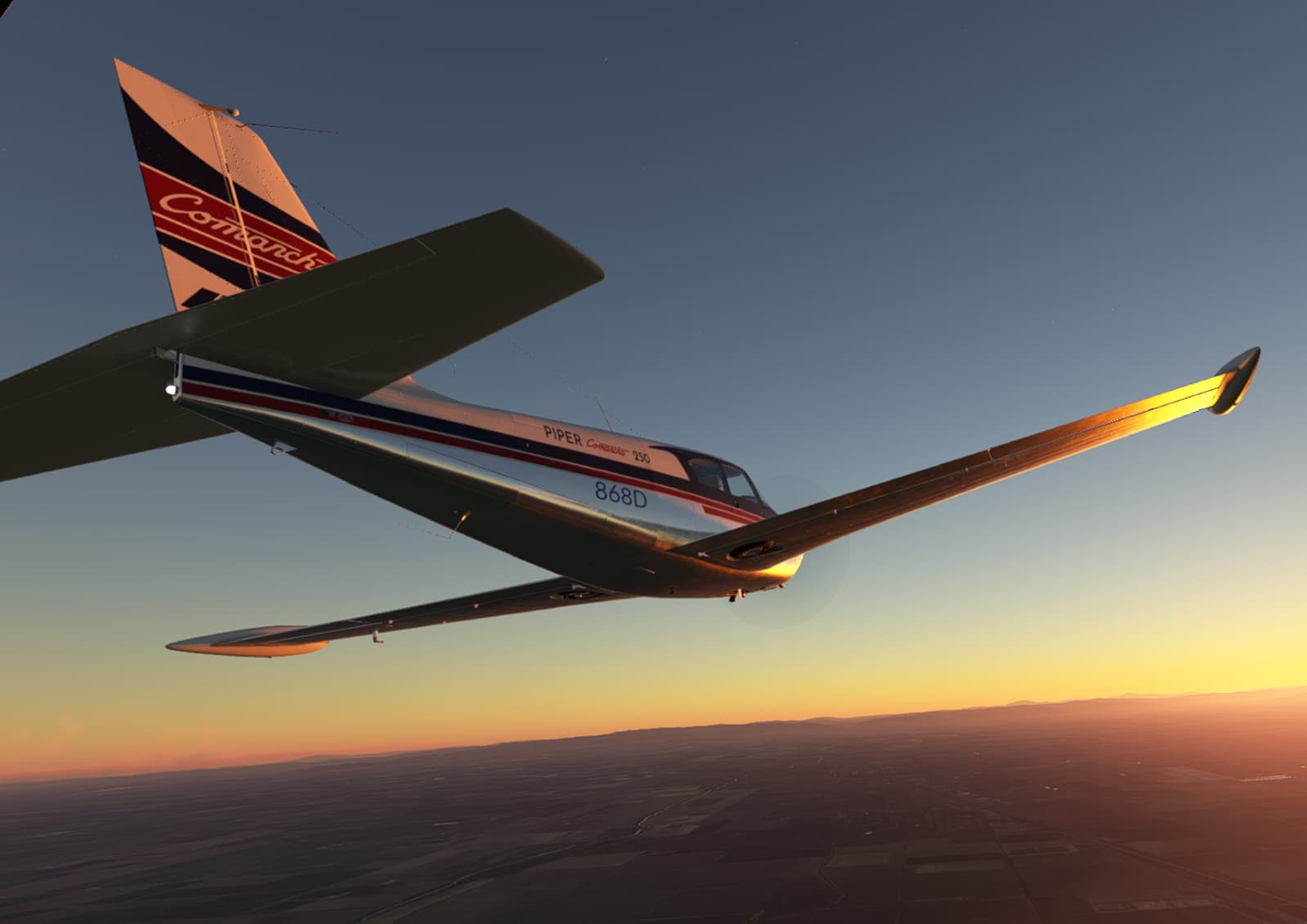 Sunset flight from Sacramento to Ukiah, chasing that sweet photogrammetry up the middle of California in the A2A Piper Comanche. I started this real-time real-weather jouney in Jacumba, CA sometime last week. I am addicted to this game.