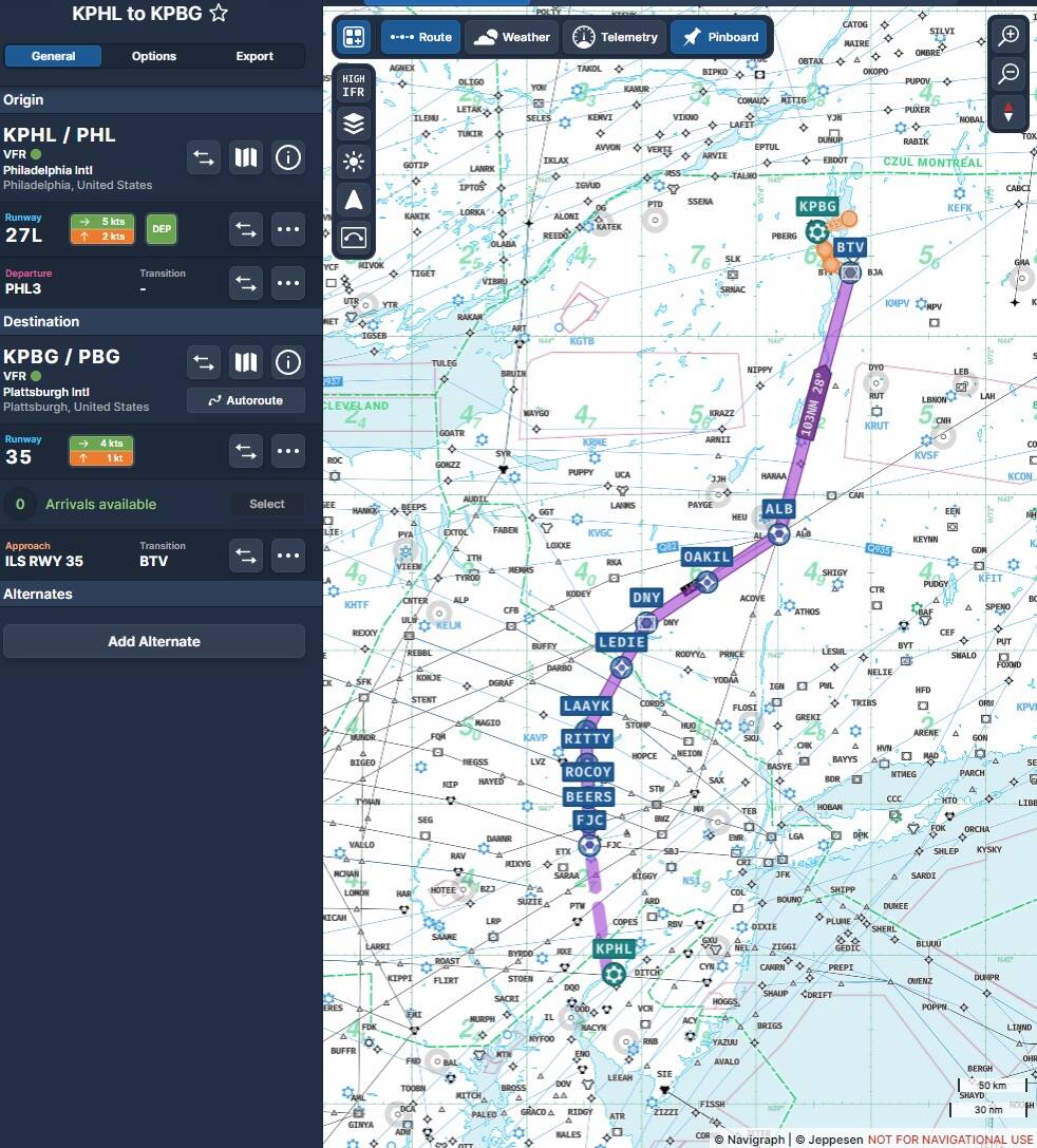 Flew the Longitude from Philadelphia (KPHL) to Plattsburgh (KPBG). I forgot to start Volanta, so the best map I can give you is the planned route from Navigraph:
