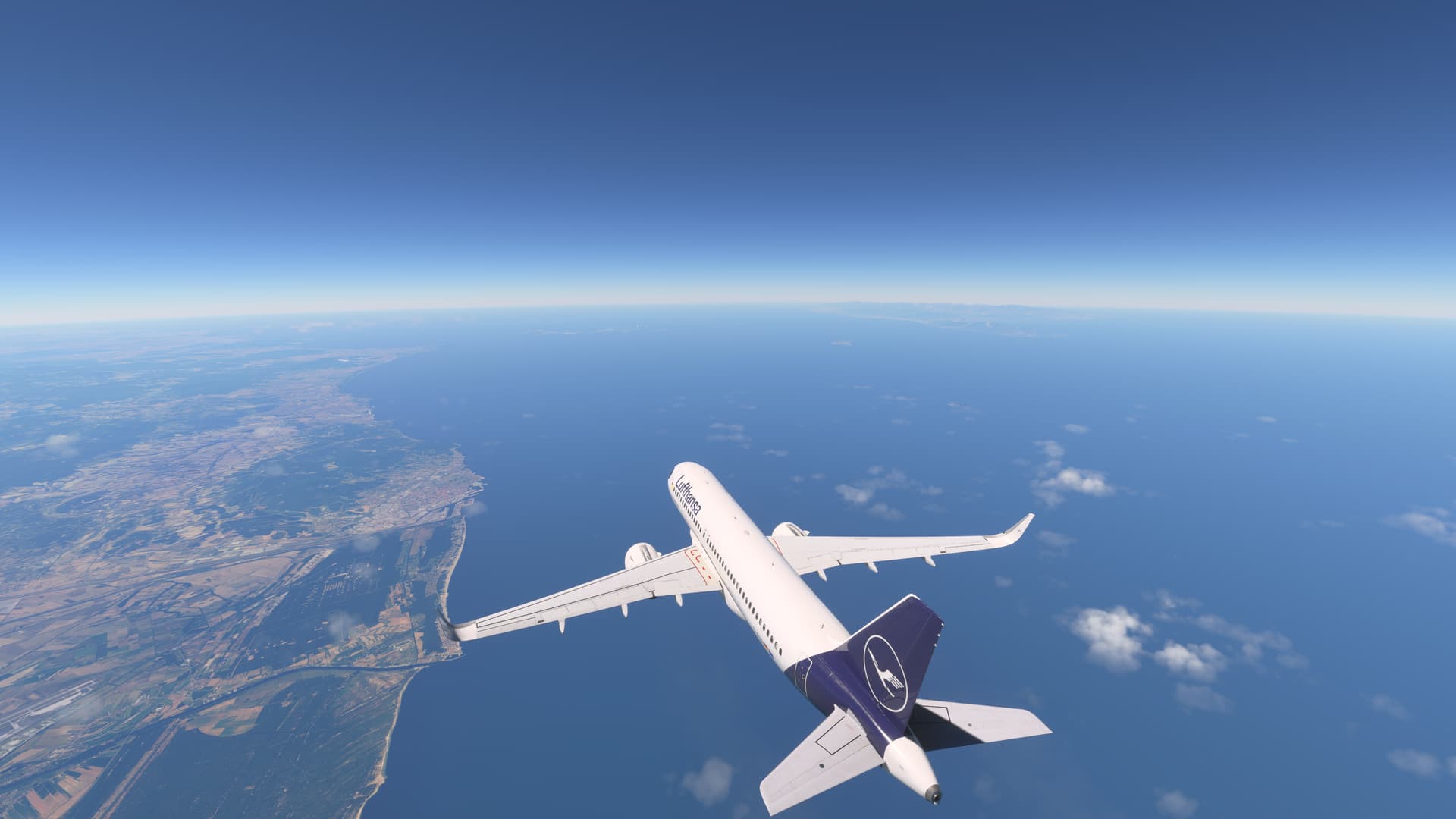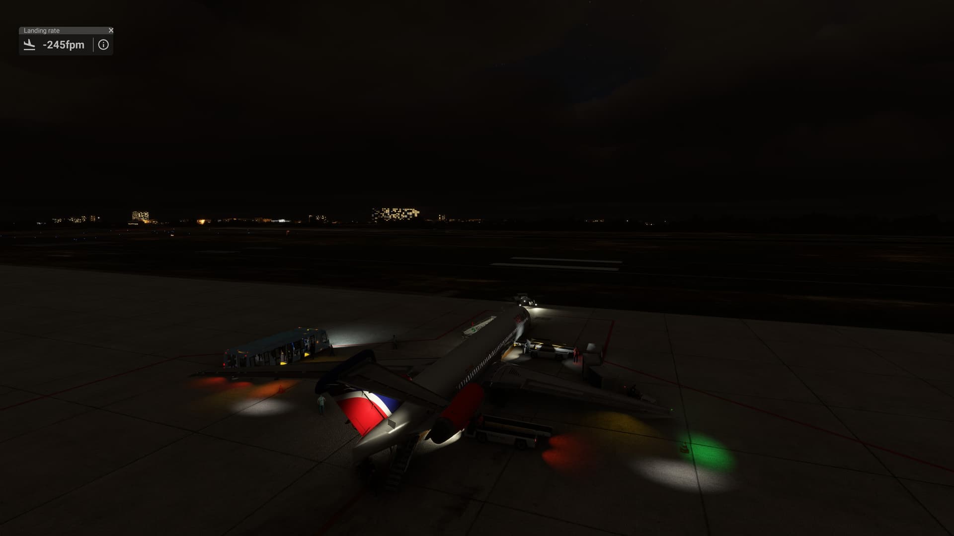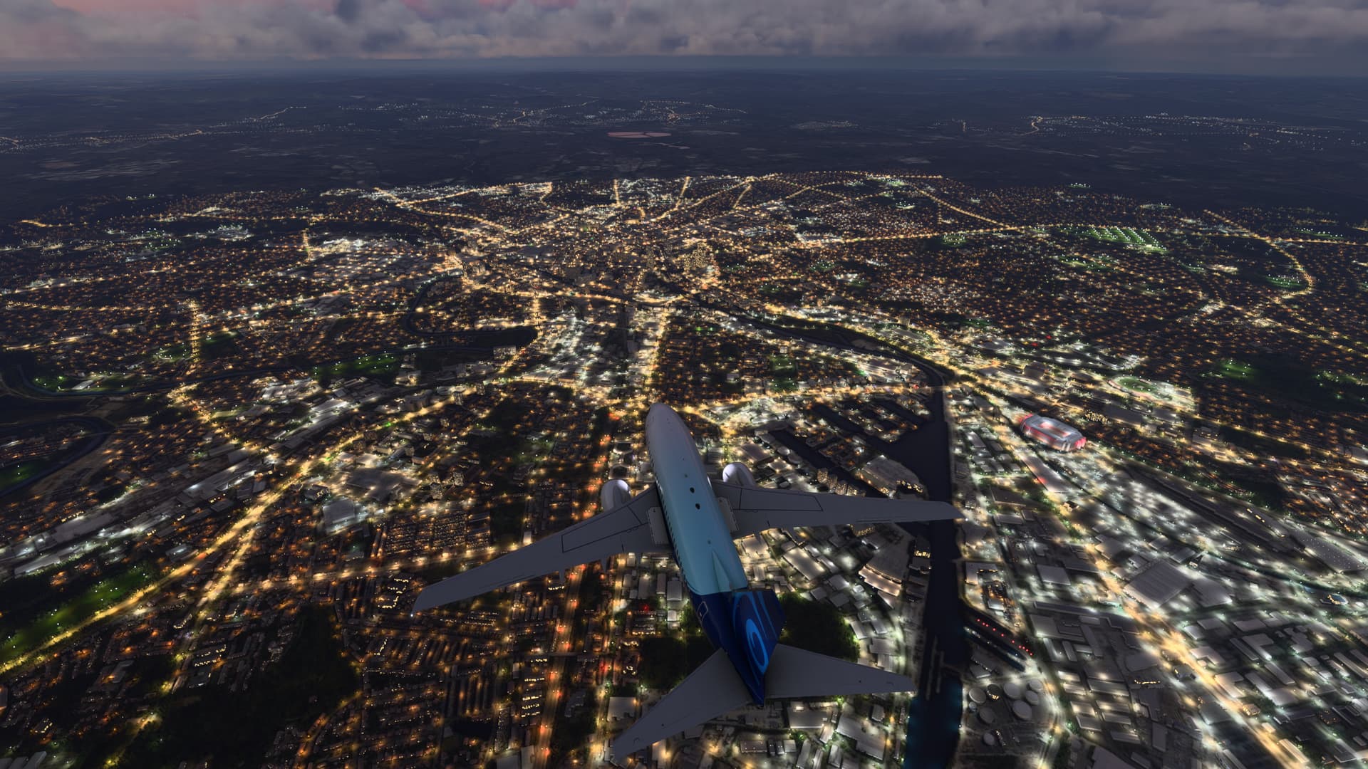 Below: Shame about the TLOD issue interrupting again, you fly towards the dark then suddenly the lights come on unless MSFS is simulating blackouts…