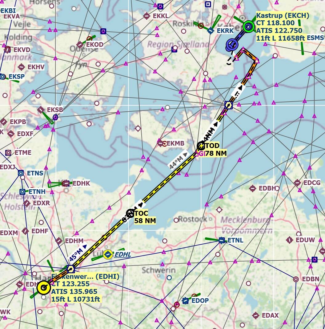 So after a few repetitions of the above, I flew from amburg-Finkenwerder (EDHI) to Copenhagen Kastrup (EKCH). Of course destination controller logged off during the flight, so ended up landing in silence.