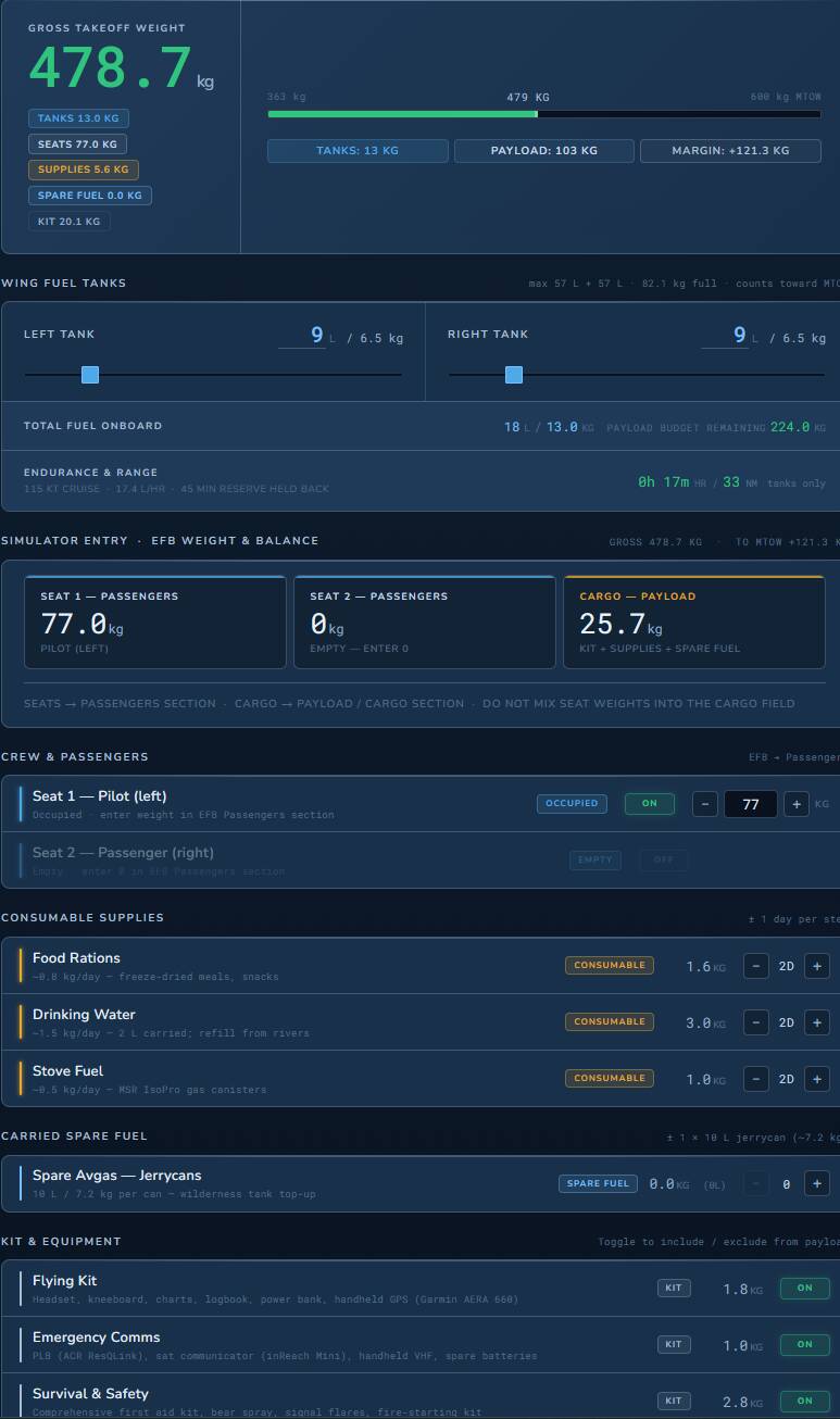Speaking of which. I used Claude.ai to make this browser based tool to help me roleplay my adventures. It’s basically a payload page but it let’s you add and subtract consumable supplies (in day steps) and spare Avgas as well as choose various kit options. It then spits out what to put in your cargo field in sim to match up the payload. It even gives you an endurance estimate with a separate readout that includes your spare cans if you have them. I even tried to mimic the in-game styling somewhat.