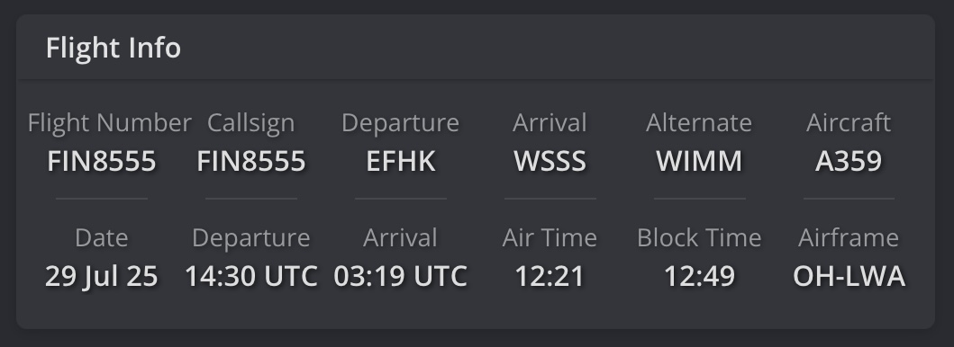 12 hours and 25 minutes after takeoff roll at Vantaa airport, I managed to somewhat smoothly land the A350 at Changi amid frequent stutters and pauses. Annoying, but I made it - a new record real-time nonstop flight for me!