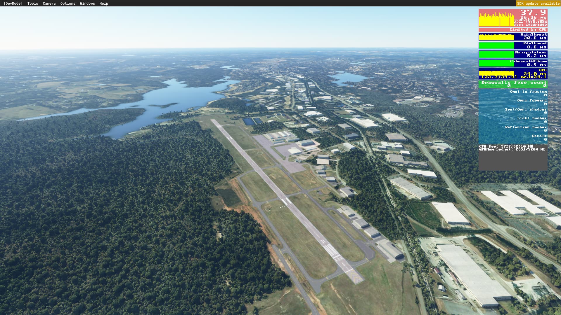 Then I enter the autogen area but here the high Object LOD means more buildings and trees, and now either my CPU or GPU falls behind creating and rendering all those objects.