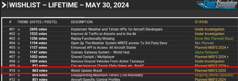 As disappointing as it would be, they could still achieve a Brazil update without photogrammetry like they’ve done with other WU’s. It would just be limited on what it would include, and likely would be more focused around POI’s, custom made airports, and terrain improvements.