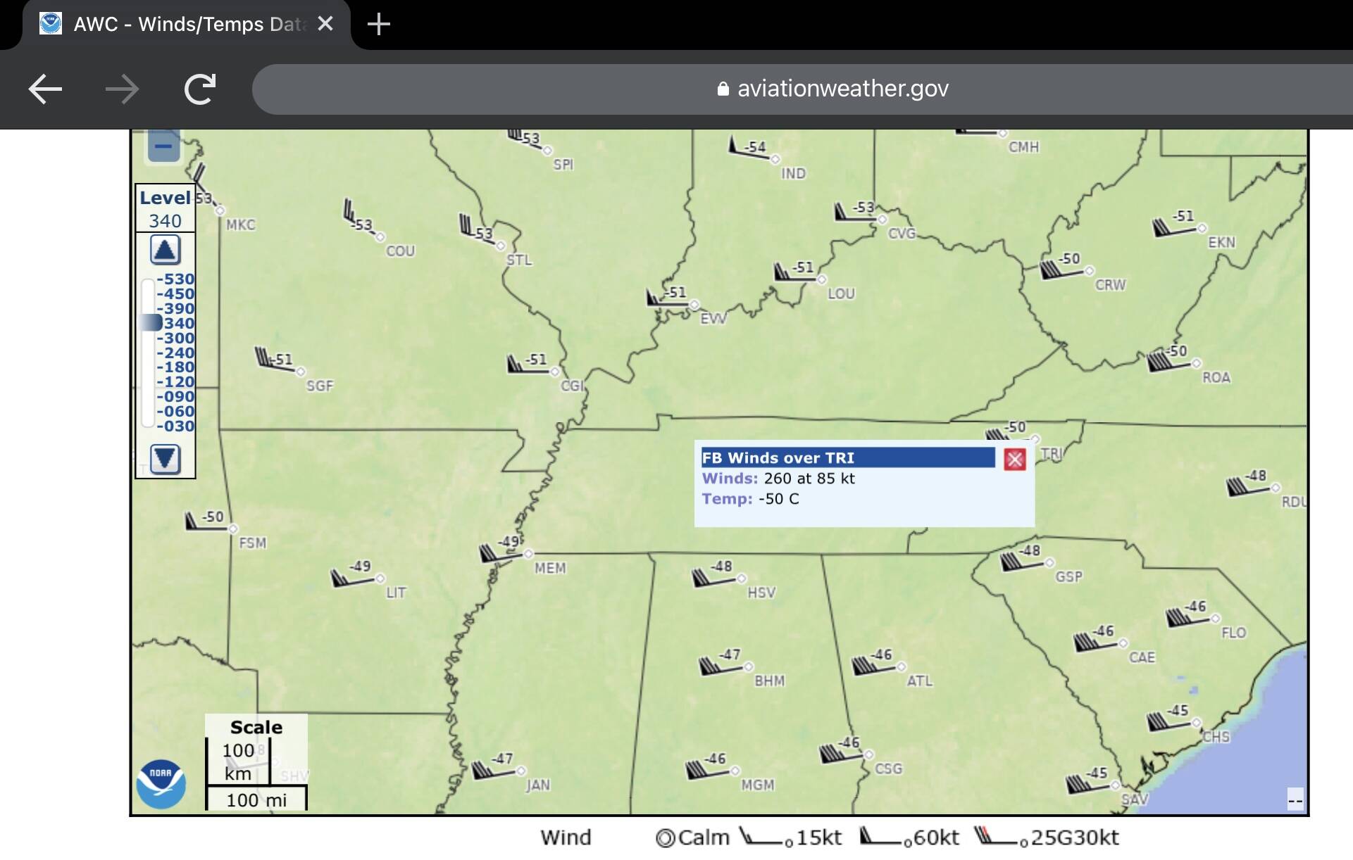 Winds aloft reported in multiple weather services - southern(ish) at 10-20 knots.
