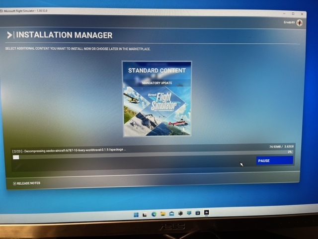 Installation Manager shows 1/23 Decompressing Asob-Aircraf-b787-10livery-xbo-aviators-0.15 fspakage… 114.79 MB/3.55 GB stuck at 3%. I suspect I caused this issue by deleting several large Asob-Aircraft some time ago because I never use them. It appears the update stuck because these acft not installed.