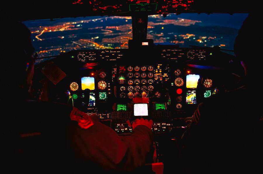 +1 for the reddish hues in night lighting I think military planes of that era would use a reddish light for the cockpit to keep the crew’s night vision.